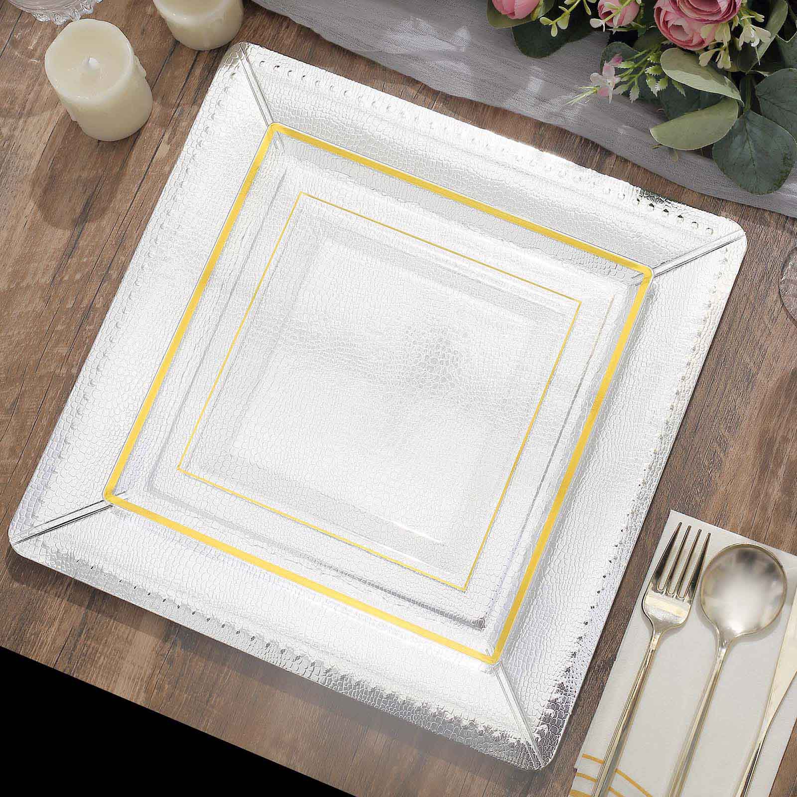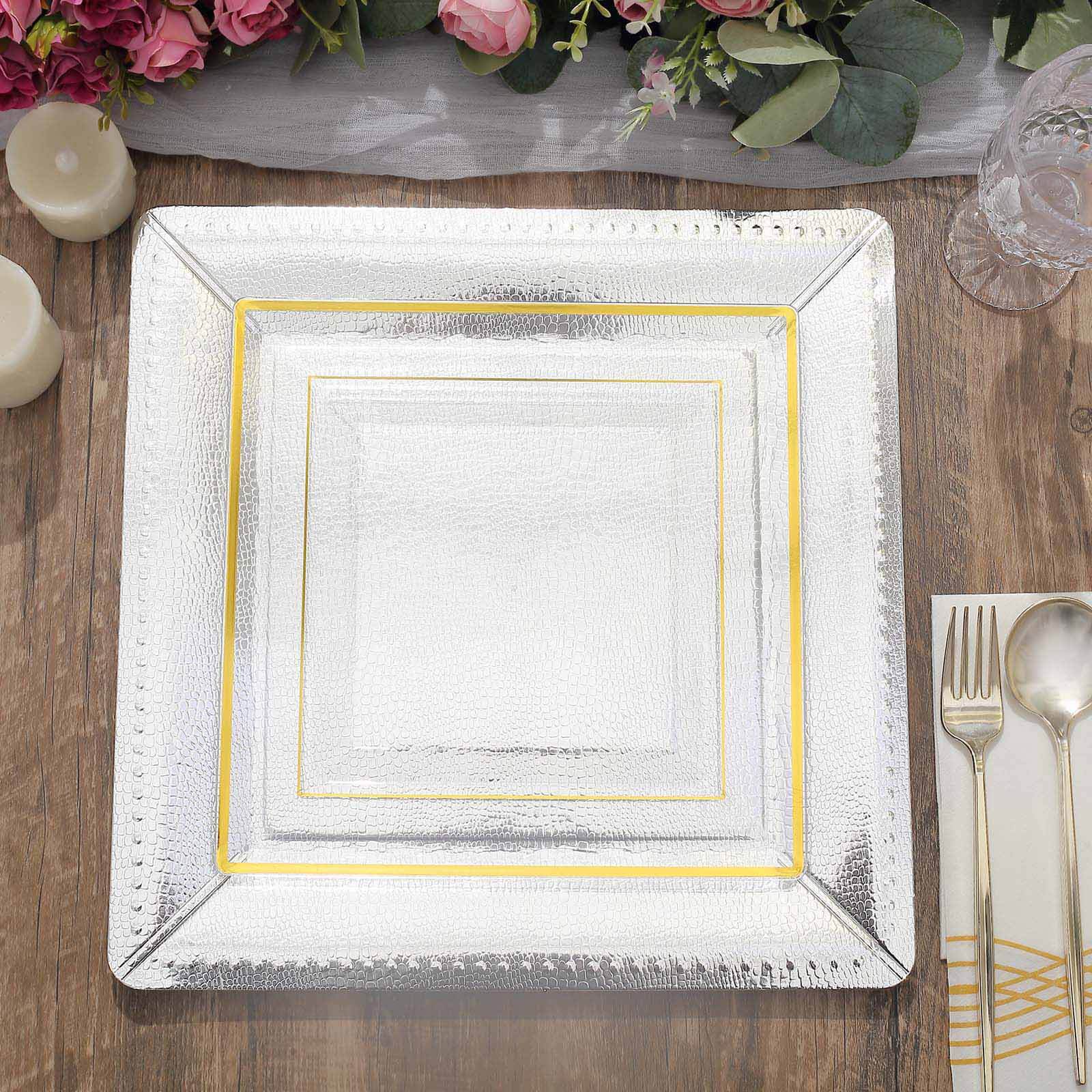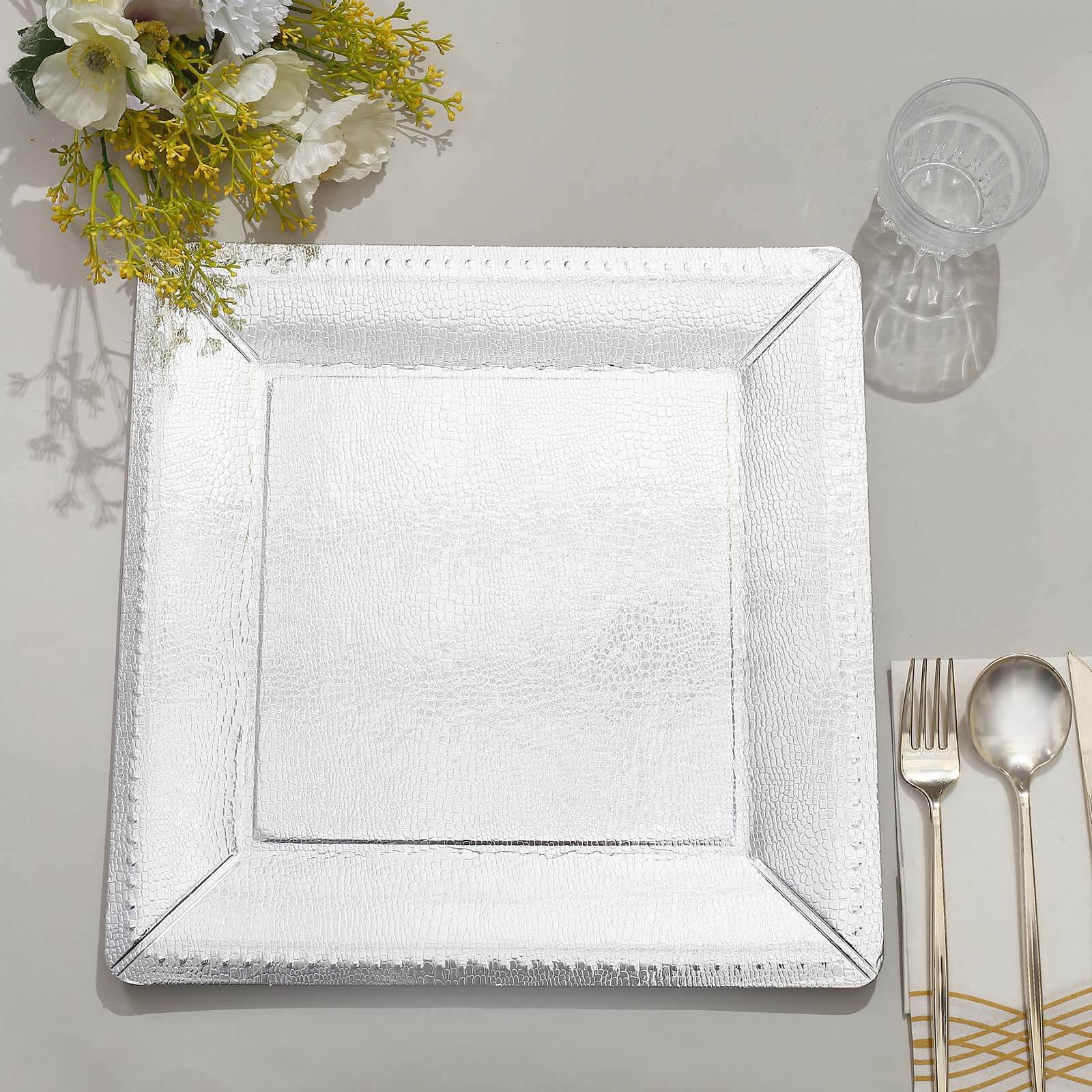 10-Pack Disposable Square Charger Plates in Silver with Leather Like Texture - 1100GSM Durable Paper Chargers 13"