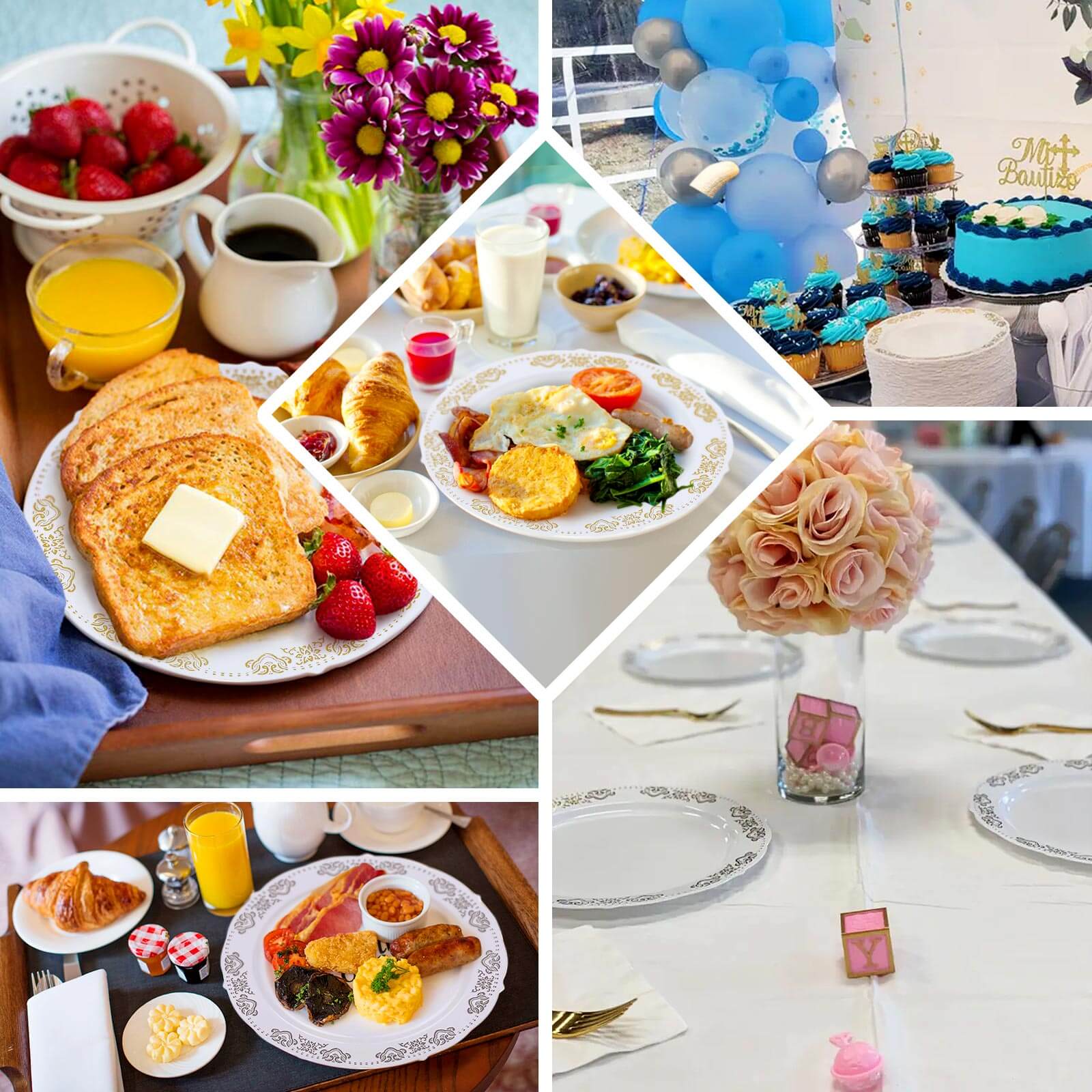 10-Pack Plastic 10" Round Dinner Plates in White with Gold Embossed Scalloped Edge - Chic Disposable Party Plates for Special Occasions & Banquets
