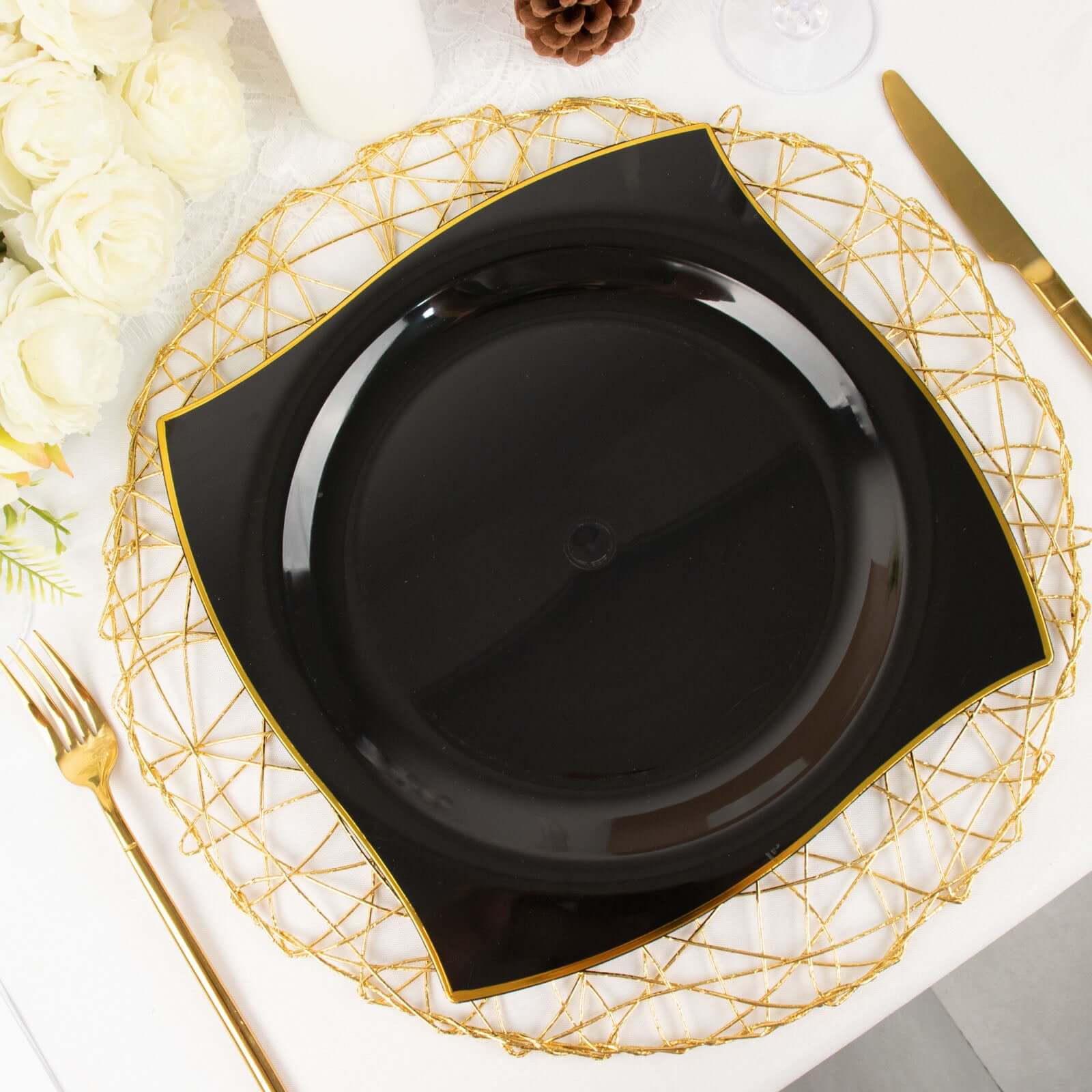 10-Pack Plastic 10" Square Dinner Plates in Black with Gold Wavy Rim Modern - Disposable Party Plates