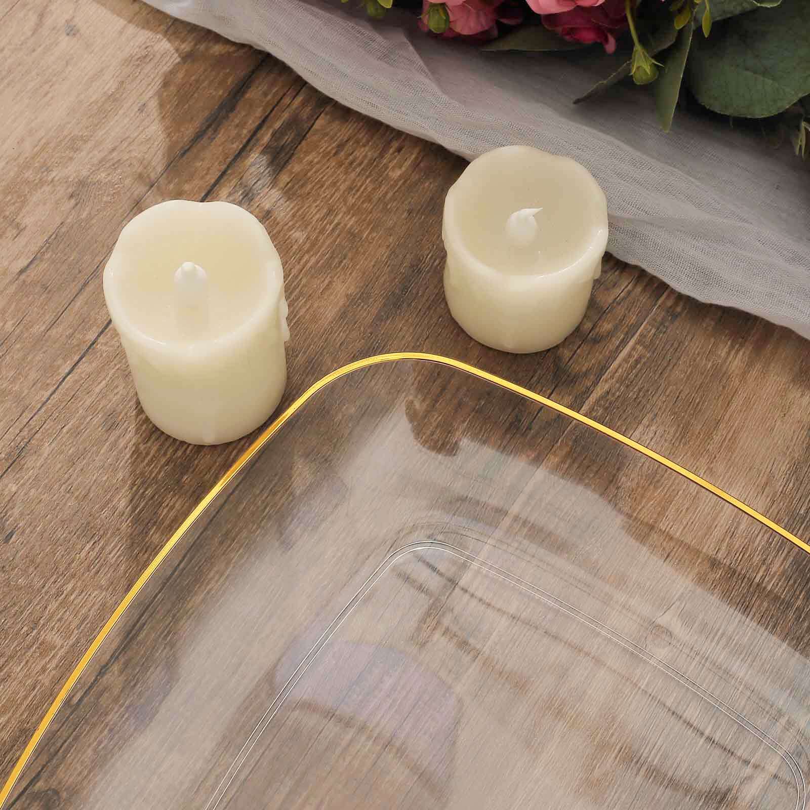 10-Pack Plastic 10" Square Dinner Plates in Clear with Gold Rim - Classy Disposable Lunch Party Plates