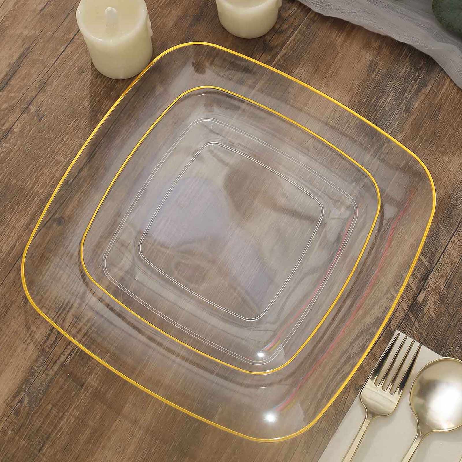 10-Pack Plastic 7" Square Dessert Plates in Clear with Gold Rim - Classy Disposable Appetizer Salad Plates