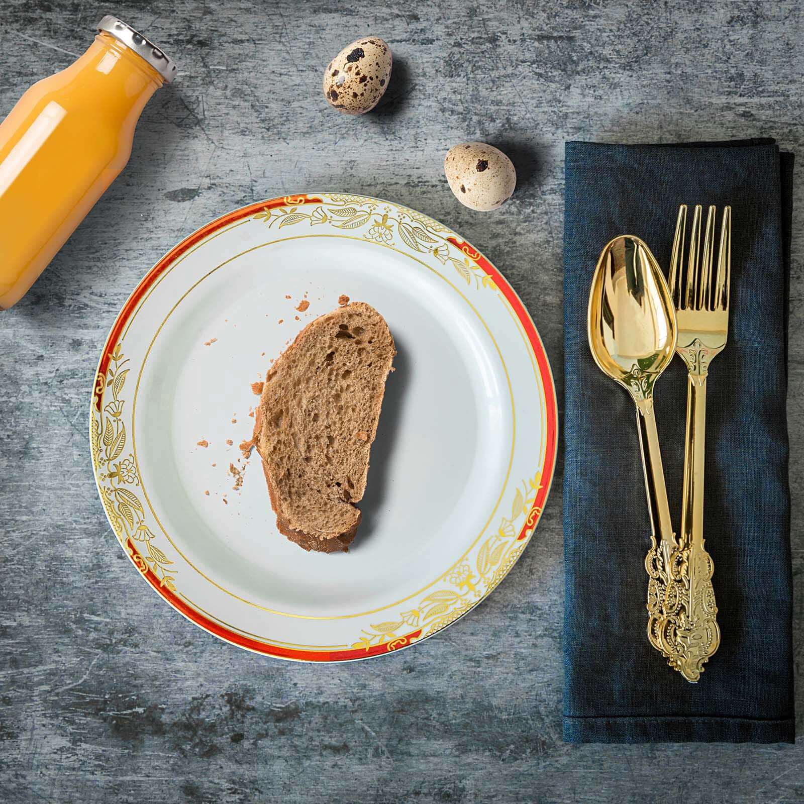 10-Pack Plastic 8" Round Dessert Plates in White with Red Rim - Stylish Gold Vine Design Disposable Salad/Appetizer Plates for Special Occasions & Celebrations