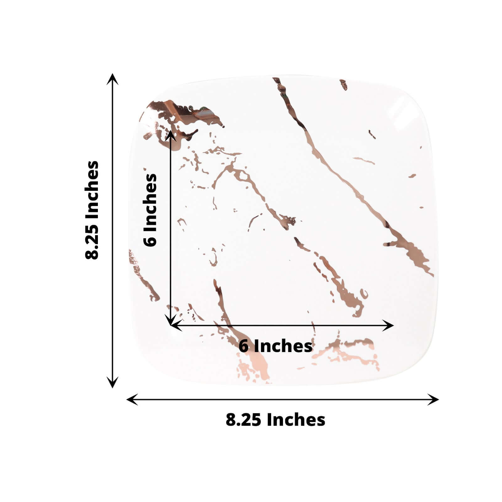 10-Pack Plastic 8" Square Dessert Plates in White with Rose Gold Marble Design - Disposable Appetizer Salad Party Plates