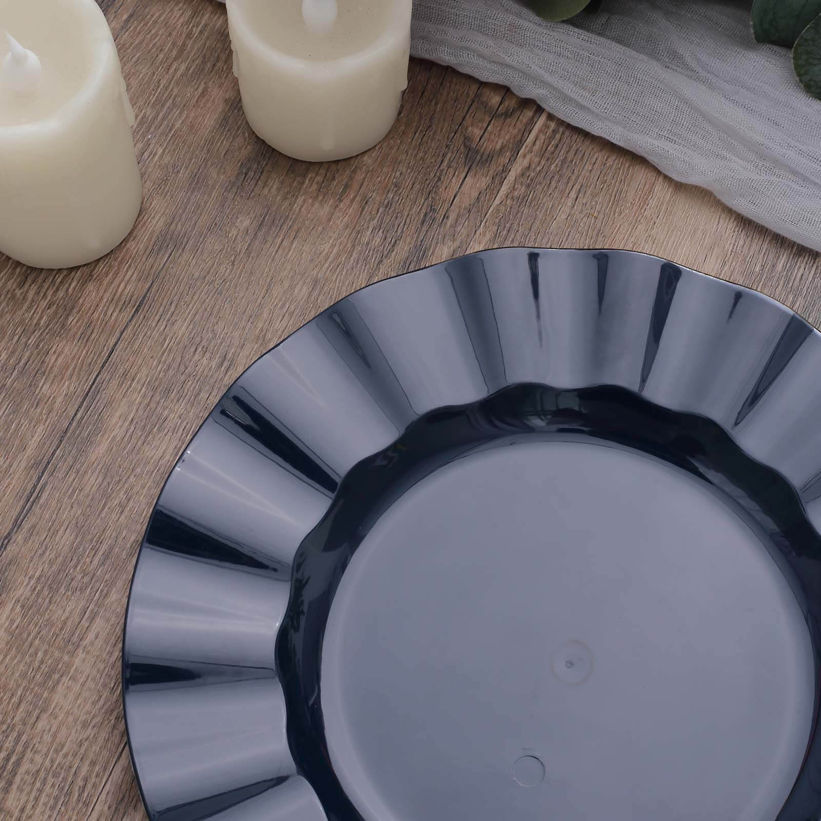 10-Pack Plastic 9" Round Dinner Plates in Navy Blue Ruffled Rim with Gold Edging - Sturdy Disposable Dinnerware