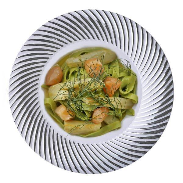 10-Pack Plastic 9" Round Dinner Plates White with Silver Swirl Rim - Disposable Party Plates