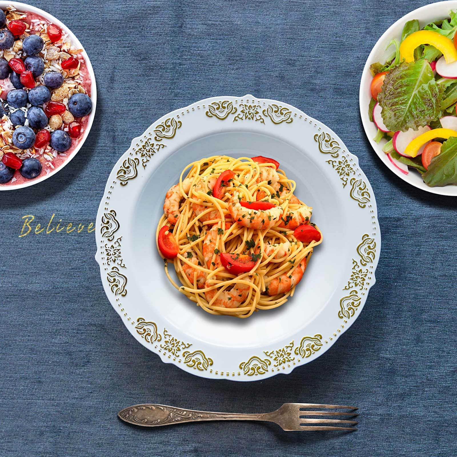 10-Pack Plastic Round Soup Bowl in White with Gold Embossed Scalloped Rim - Sturdy Disposable Salad Dessert Bowls for Catering & Events 12oz