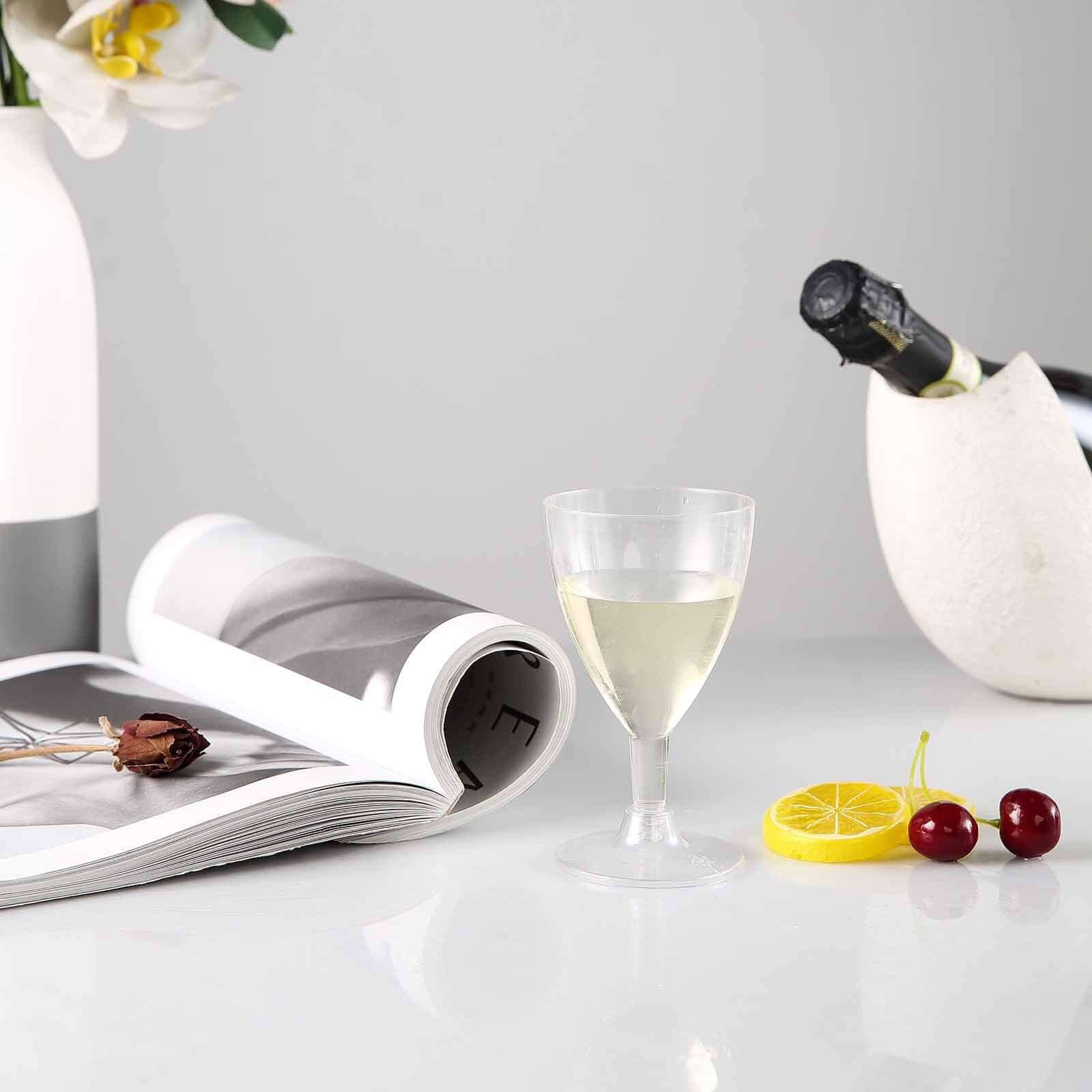 A stylish disposable wine glass, shiny, clear and made from high-quality plastic, each piece is brilliantly crafted with flawless, contemporary finish. Featuring an elegant classical design, this glass has a hollow stem that can be detached easily for convenient after party storage. Update your stemware with this classical clear wine glass that features a simple, versatile design that fits seamlessly into any existing tableware or dinner Decor. Serve your favorite bubbly beverages, frozen cocktails, desserts, and other delights in a charming creative style. The convenience of disposability avoids any risk of breakage or shattering, and also makes the cleanup time a breeze. The hollow stem provides a great depth within glass, the bubbles floating from base to the rim, tempting your high-spirited guests. Our elegant disposable glasses are an ideal choice for indoor or outdoor events, holiday parties, weddings, showers, get-together, and family reunions.