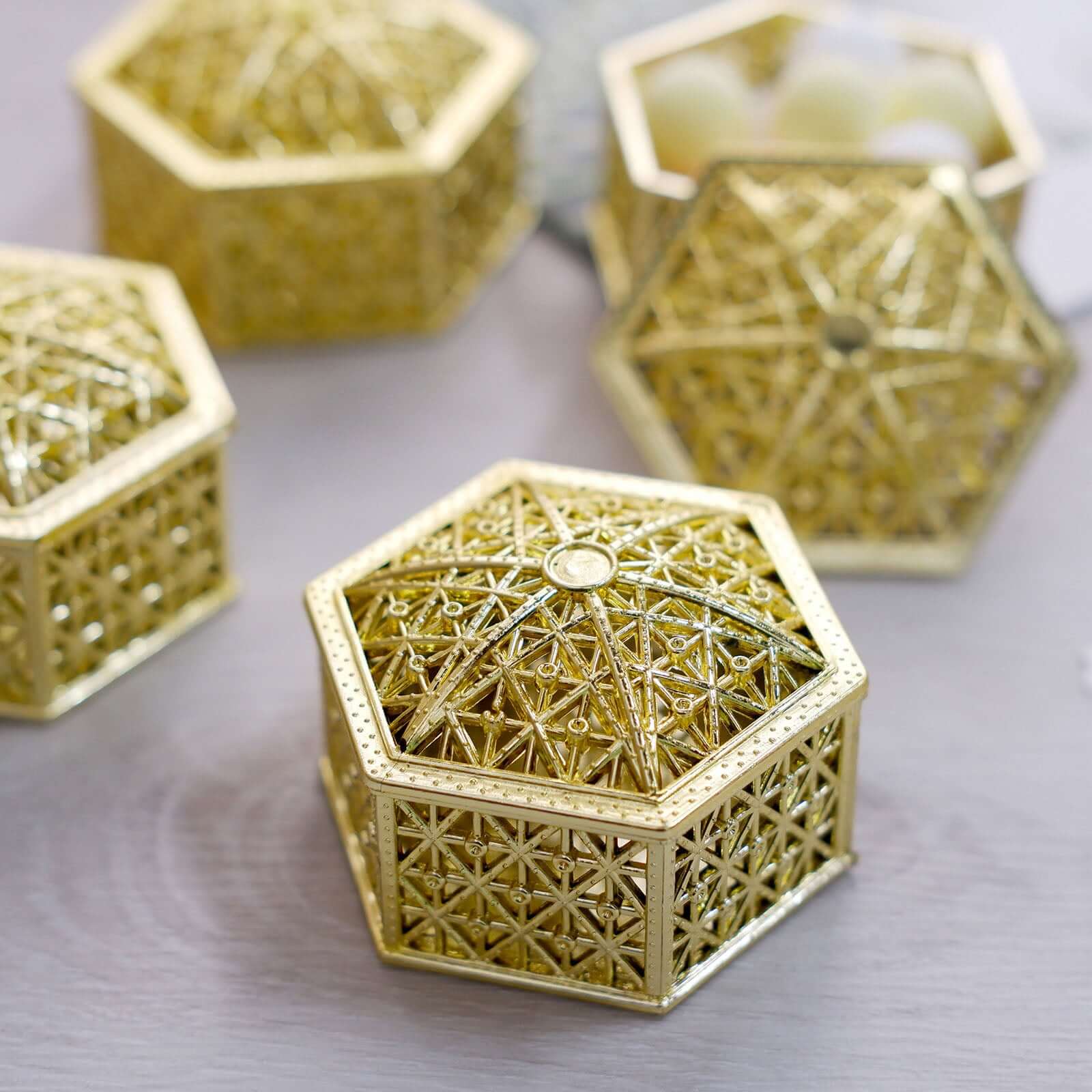 12-Pack Vintage Hexagon Gift Box Candy Containers Gold - Stylish Hollow Favor Boxes for Jewelry 3"