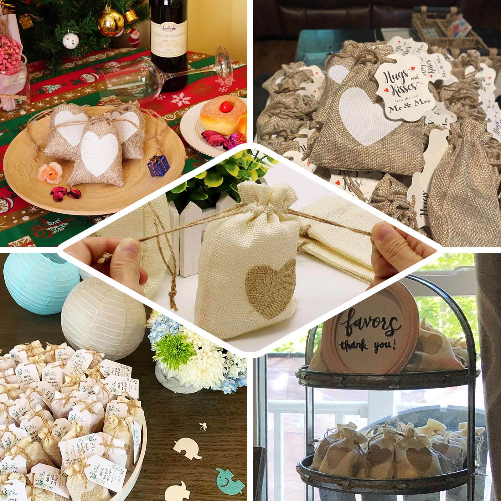 20 Pack 4"x5" Natural Ivory Heart Design Jute Burlap Gift Bags With Drawstring, Rustic Wedding Party Favor Bags