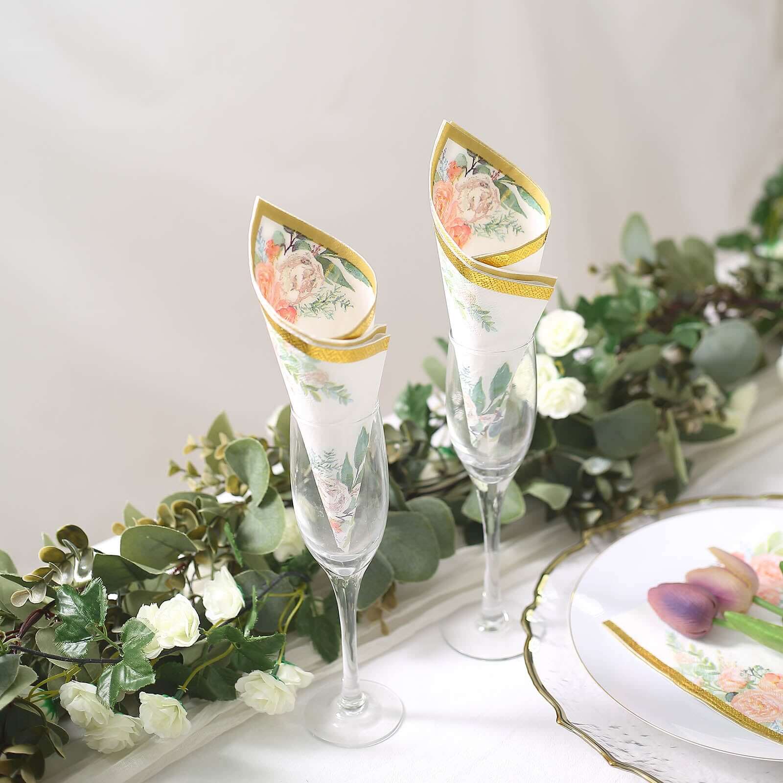 20-Pack Paper Cocktail Napkins with Pink Peony Floral Design and Gold Trim White - 2 Ply Wedding Beverage Napkins 18GSM