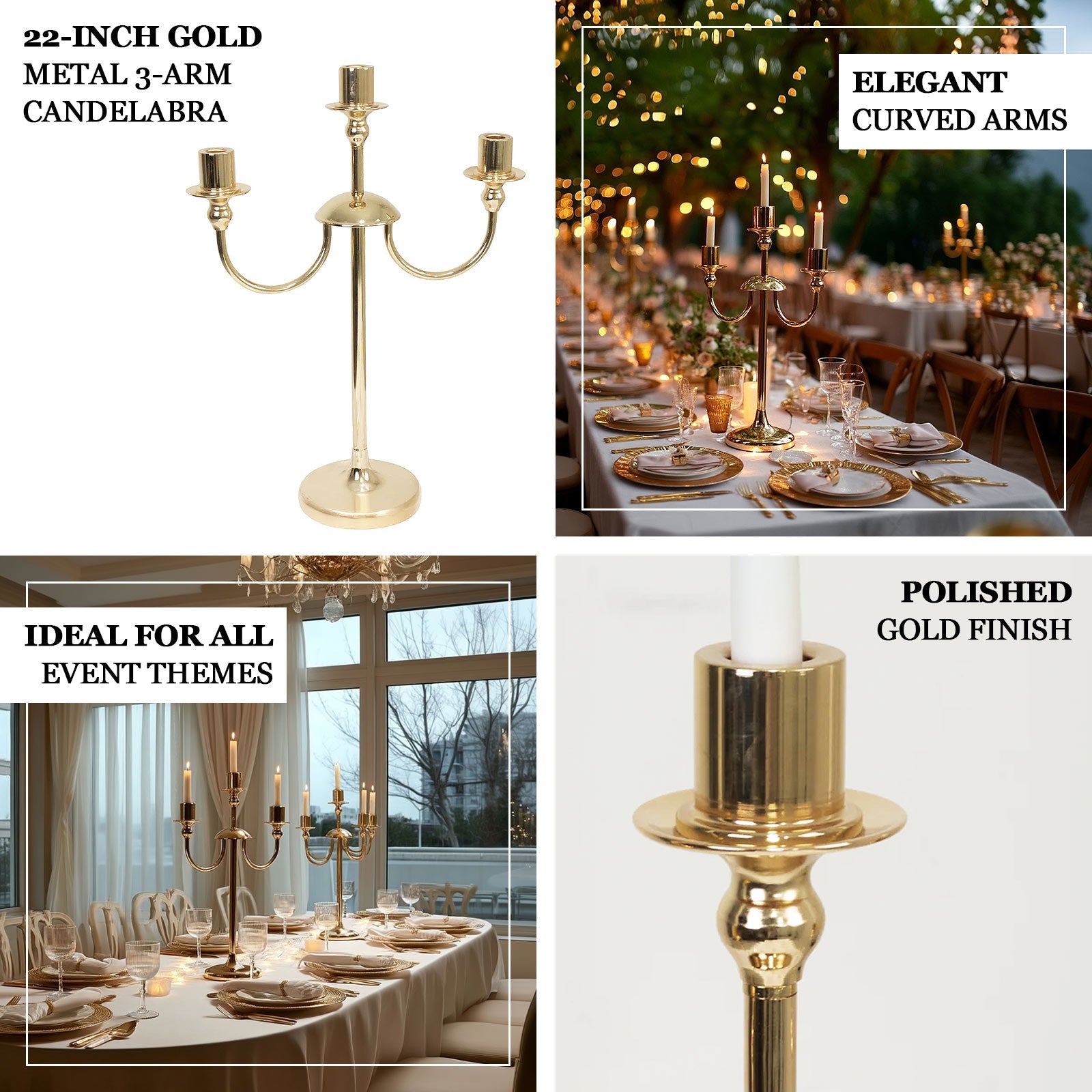 22" Tall Gold 3-Arm Metal Candelabra – Modern Taper Candle Holder Centerpiece Stand