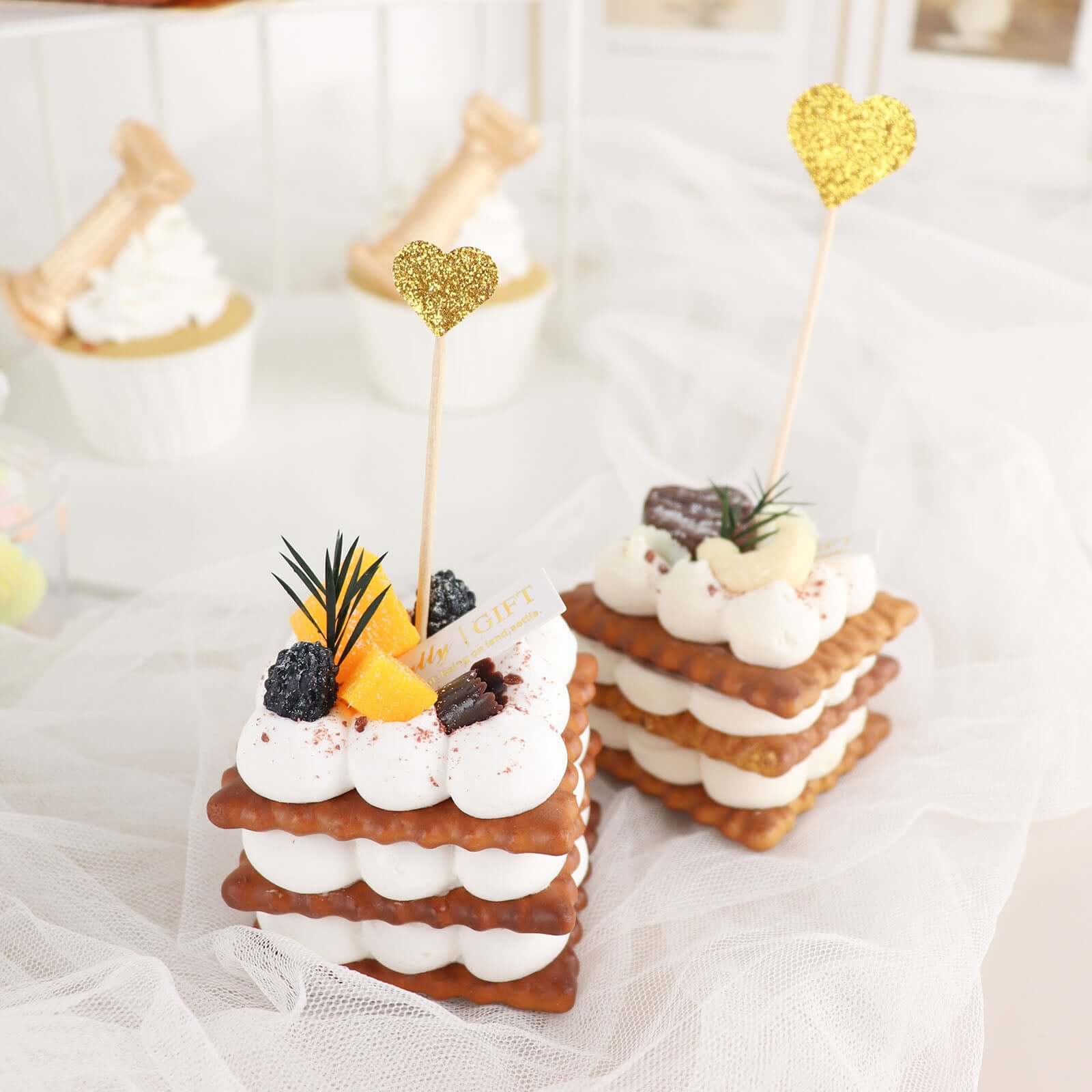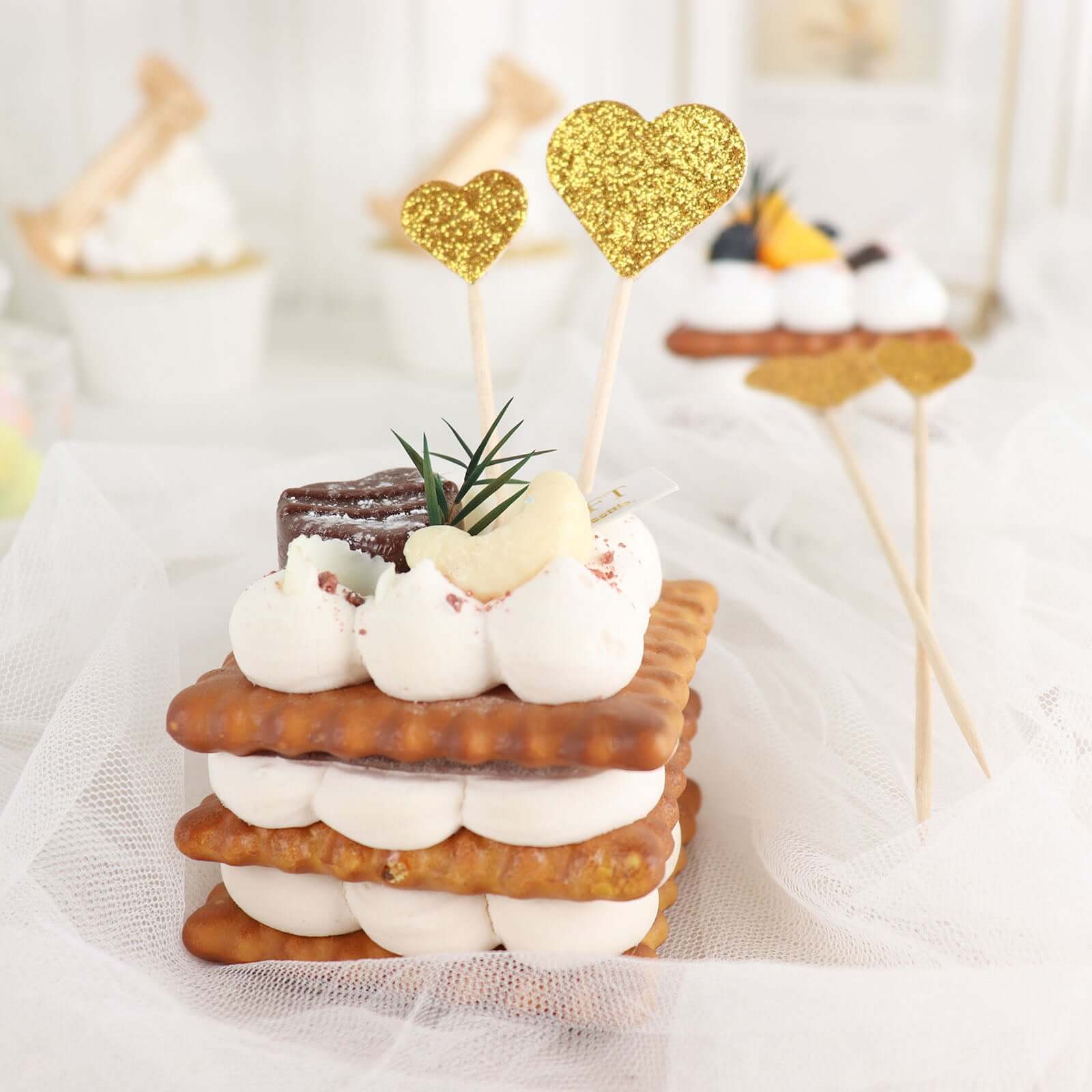 24-Pack Cupcake Topper Picks Heart Shaped Design Glitter Gold - Party Cake Toppers 4.5", 4"