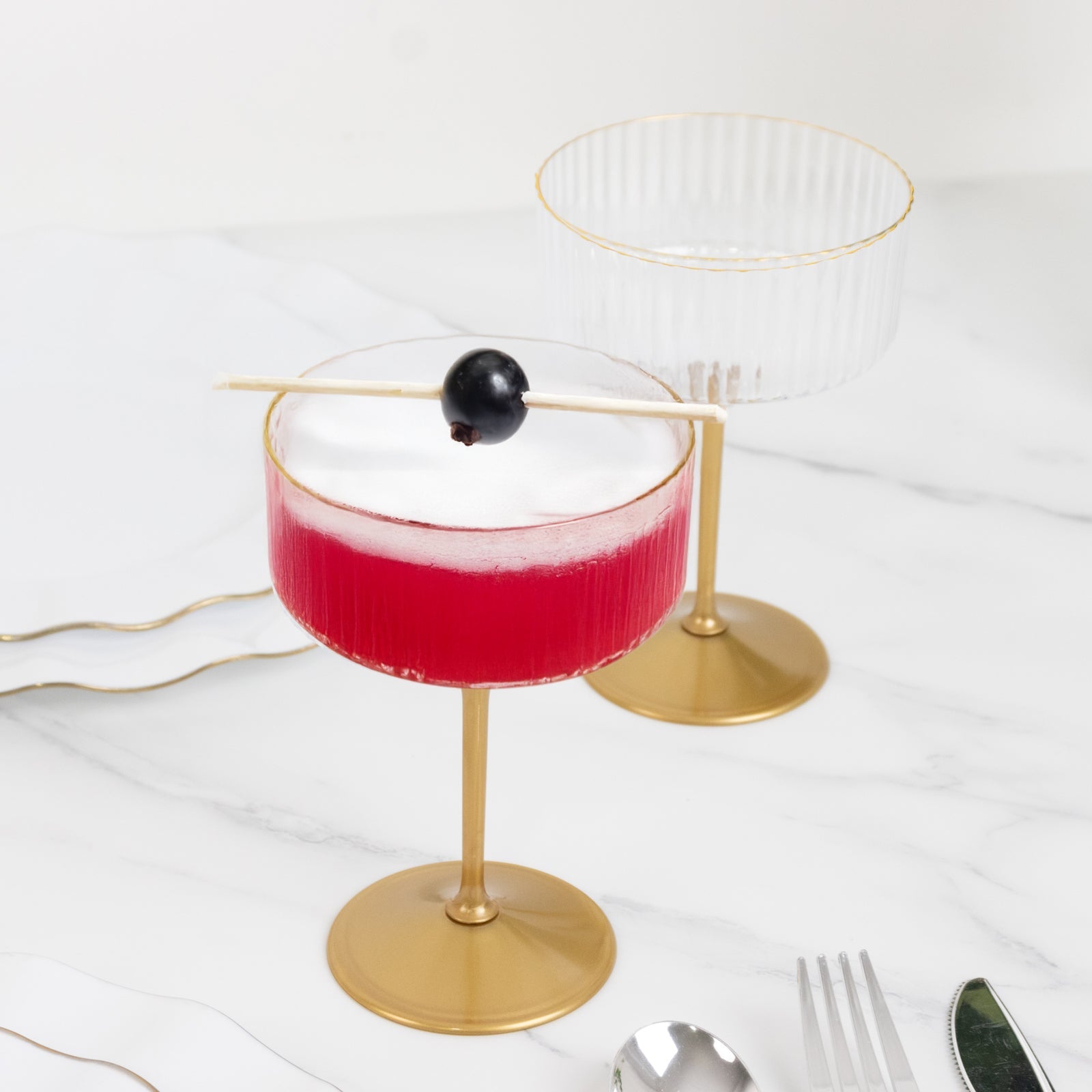 24-Pack Plastic Cocktail Glasses – 10oz Clear Ribbed Premium Disposable Coupe Champagne Cups with Gold Detachable Stem & Base – Party & Event Drinkware