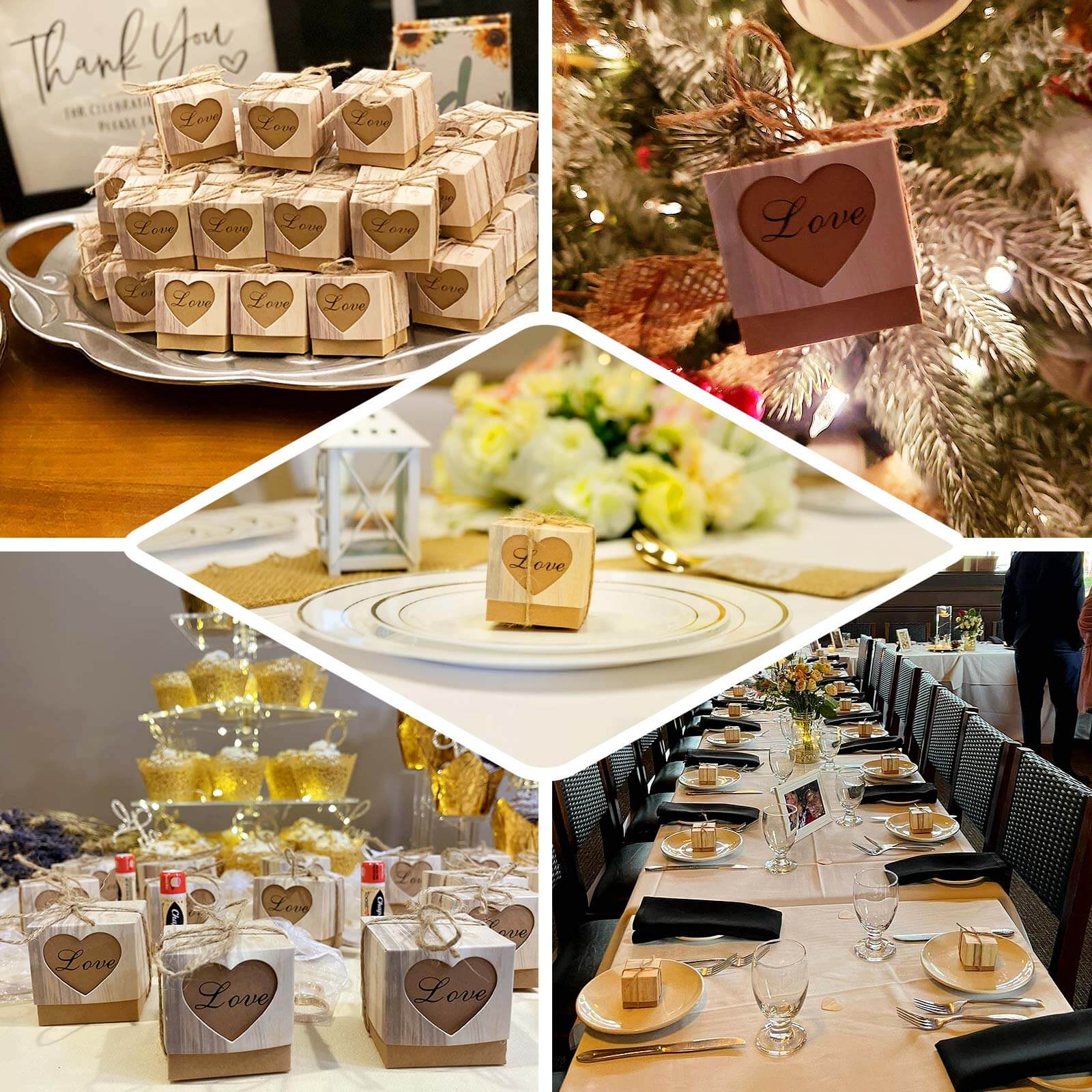 25 Pack 2.5" Rustic Wood Pattern Natural Brown Paper Candy Gift Boxes, Square Party Favor Boxes with Burlap Jute Twine and Love Heart Cut Out