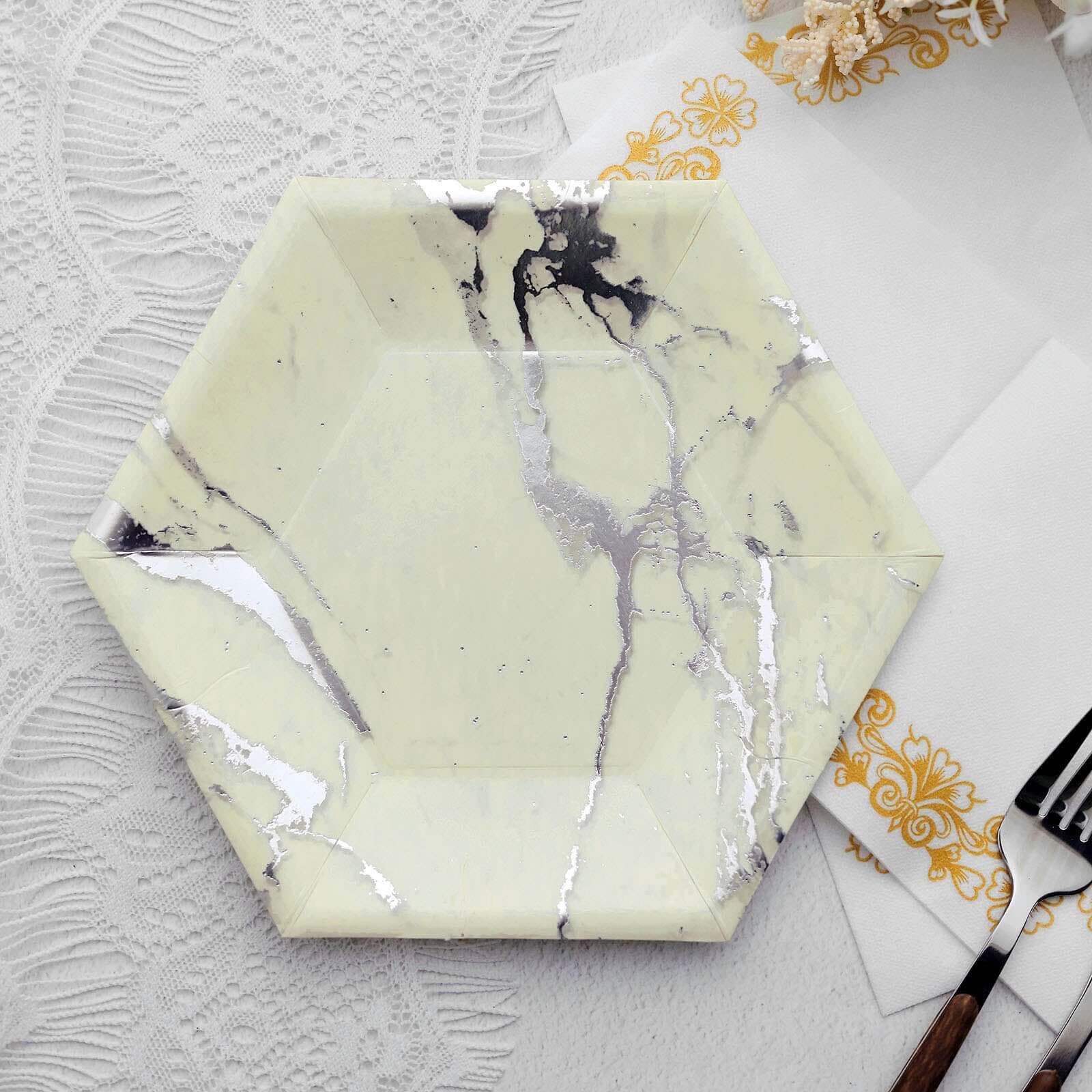 25-Pack Paper 8.5" Hexagon Dessert Plates in Ivory with Silver Marble Design - Disposable Geometric 400GSM Appetizer Salad Plates for Events & Banquets