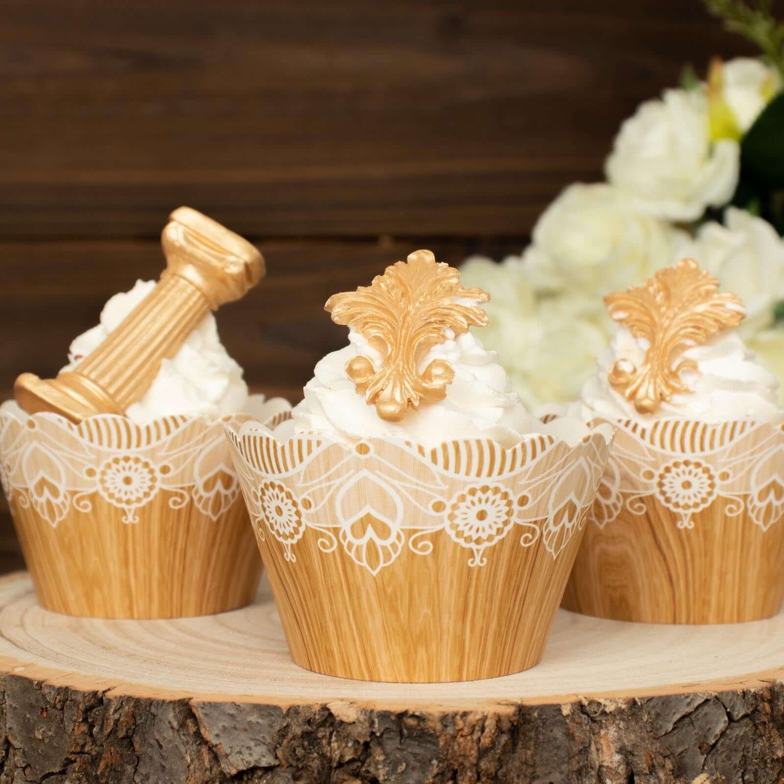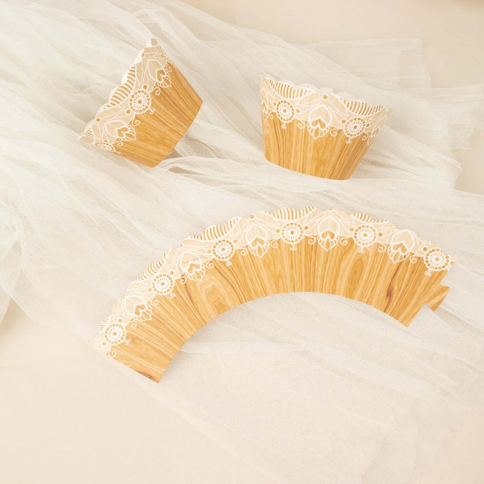 25-Pack Paper Cupcake Wrappers Wood Grain and Lace Print Design Natural - Boho Muffin Baking Cup Wraps