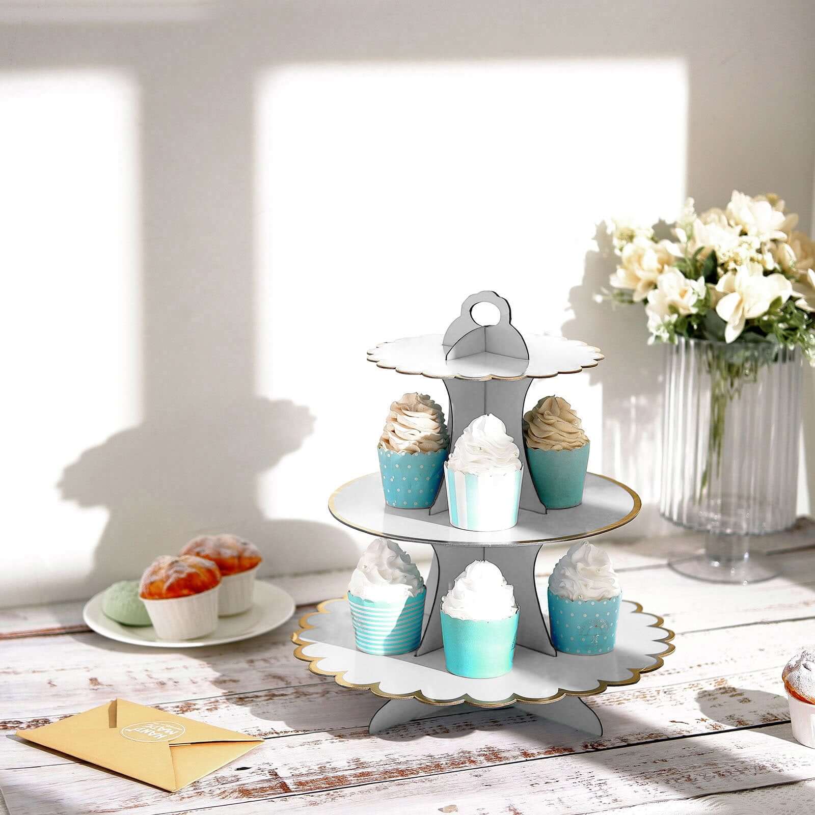 3-Tier Cardboard Cupcake Stand White - Sturdy & Collapsible Dessert Treat Tower with Gold Scalloped Rim for Baby Shower Wedding & Party Decor 13"
