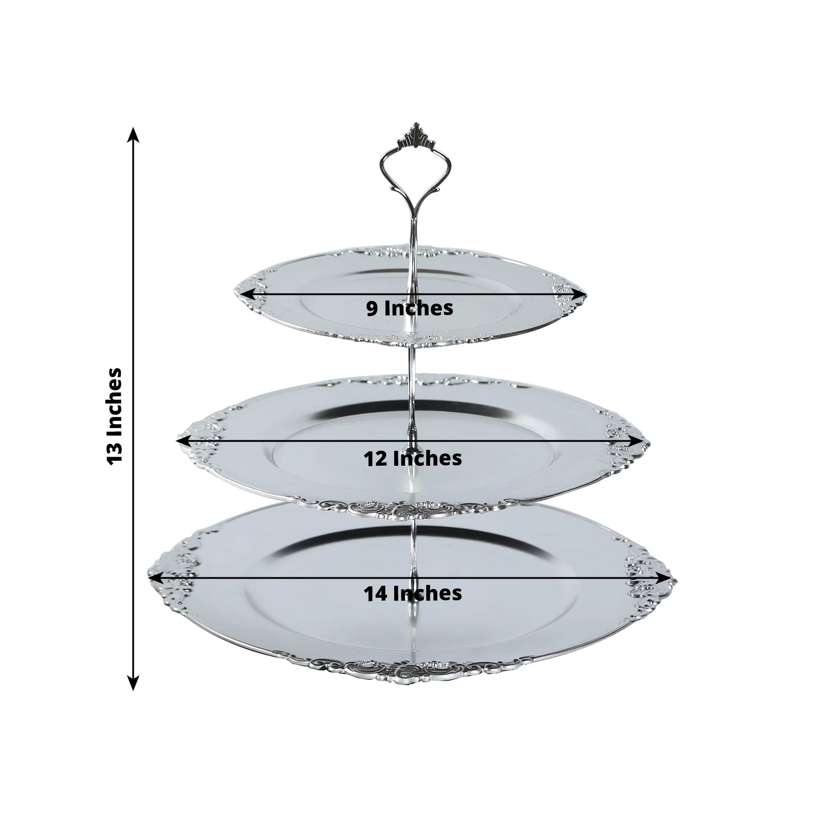 3-Tier Plastic Round Cupcake Stand Metallic Silver with Baroque Rim & Top Handle 13"