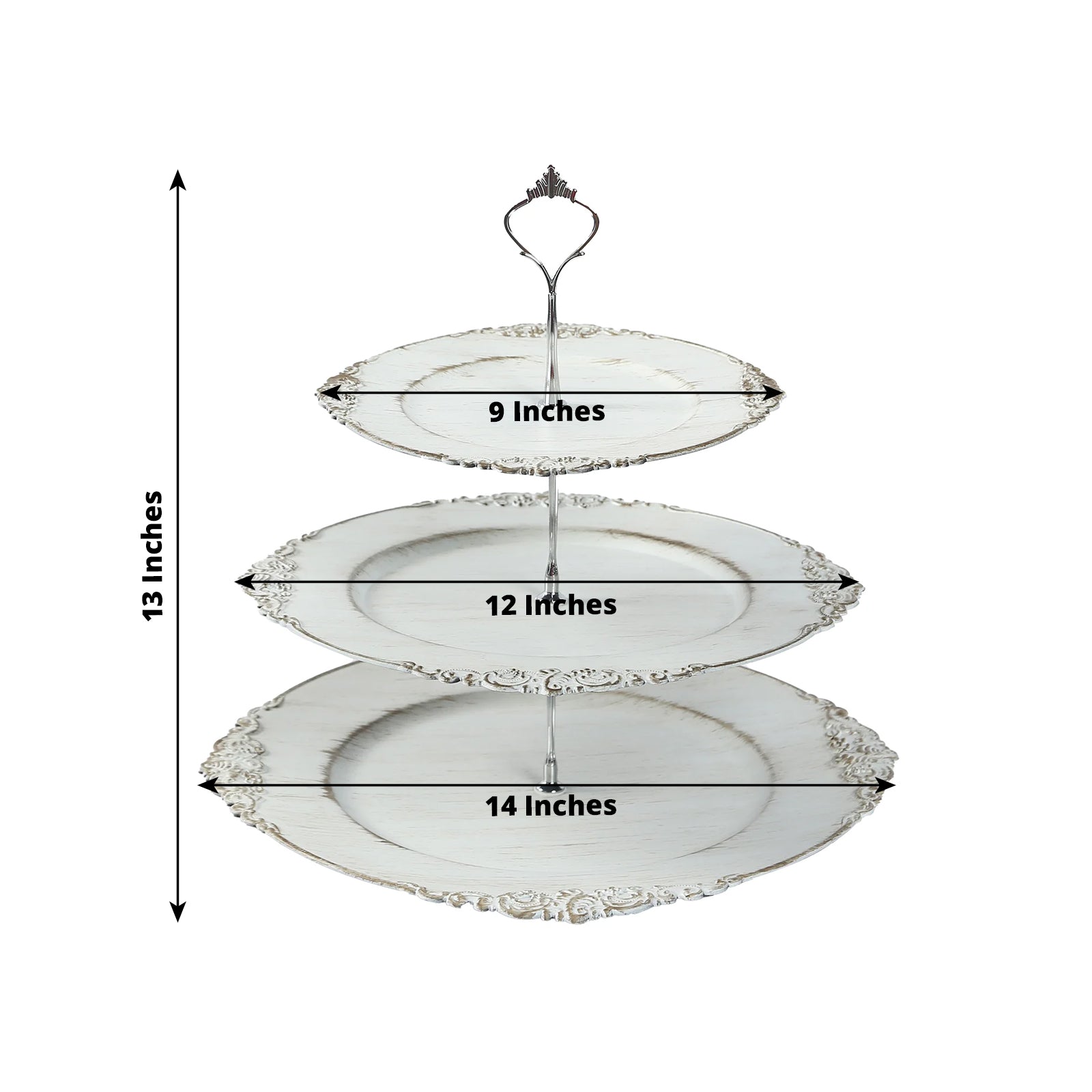 3-Tier Plastic Round Cupcake Stand Whitewashed with Antique Gold Baroque Rim & Top Handle 13"