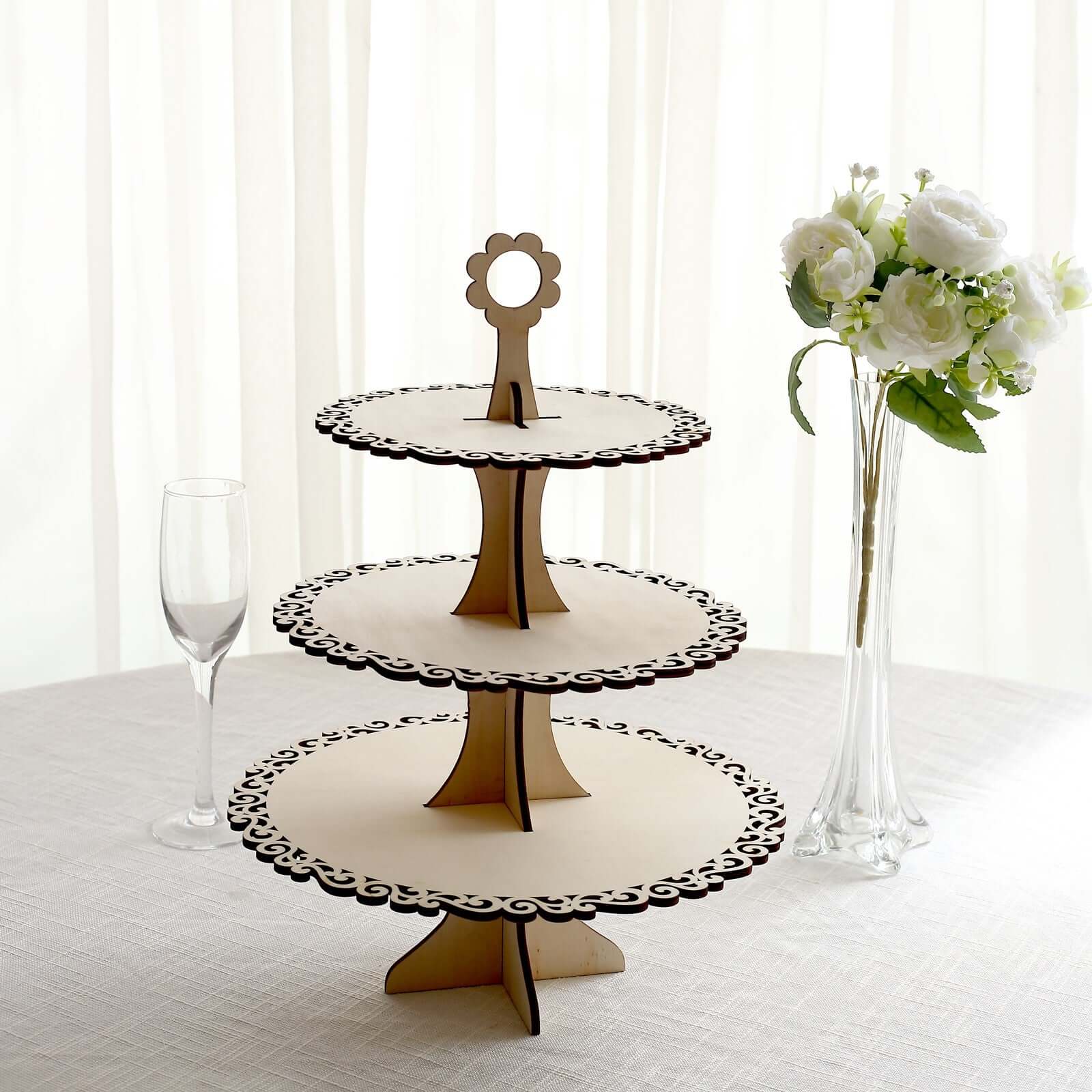 3-Tier Wooden Cupcake Stand Floral Edge Design Natural - Rustic Round Dessert Display Table Centerpiece 16"