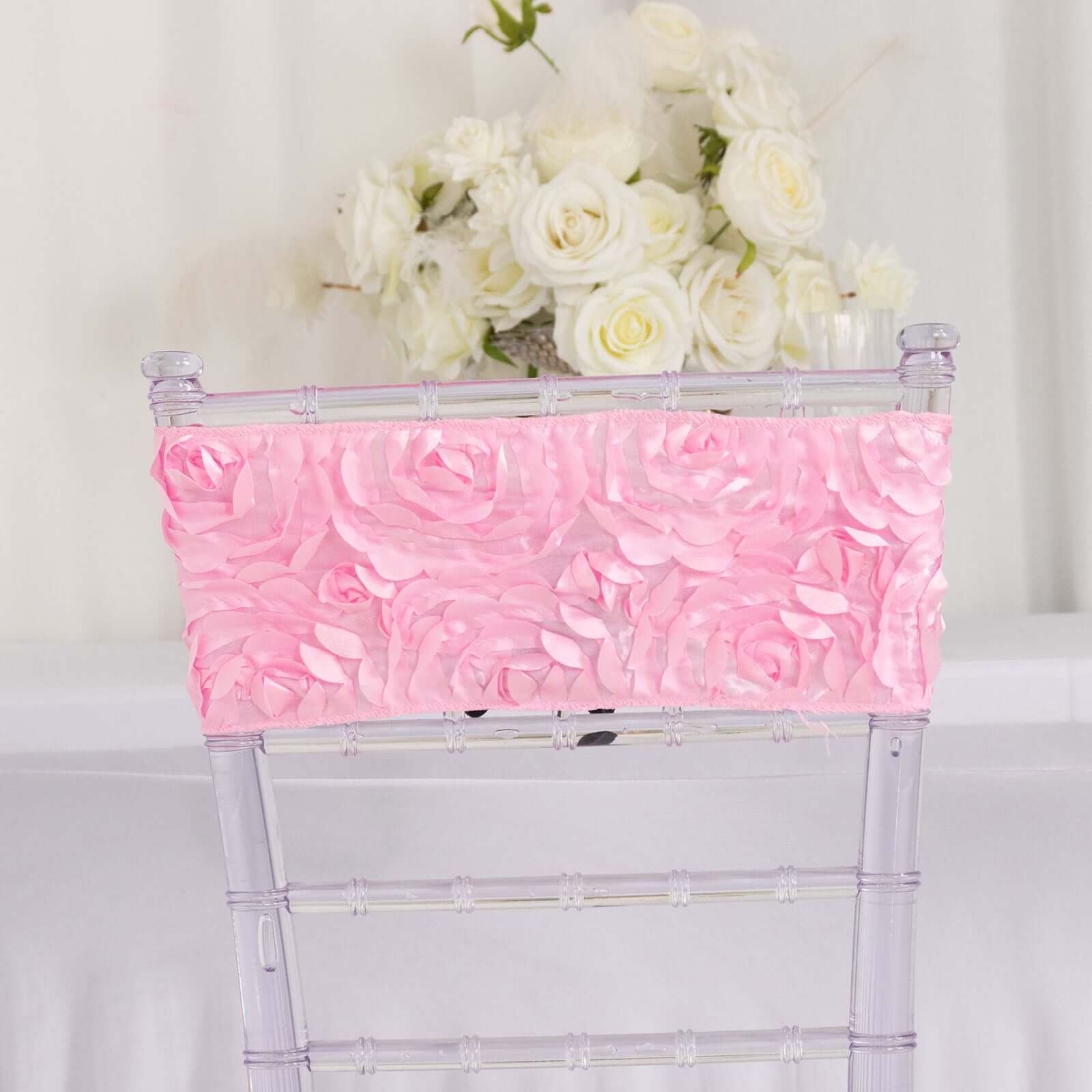 5 Pack Satin Spandex Chair Sashes Pink - Rosette Design Stretch Chair Bands 6"x14"