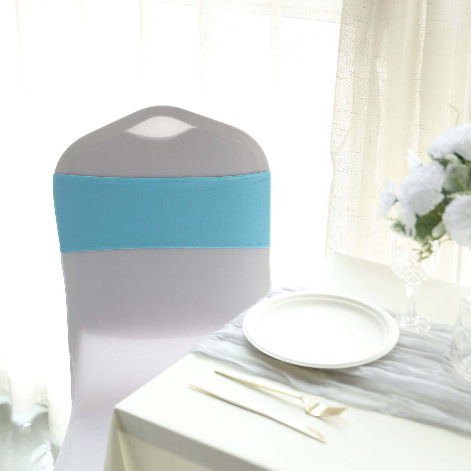 5 Pack Stretch Spandex Chair Sashes Turquoise - Reusable Chair Bands with Silver Diamond Ring Slide Buckle 5"x14"