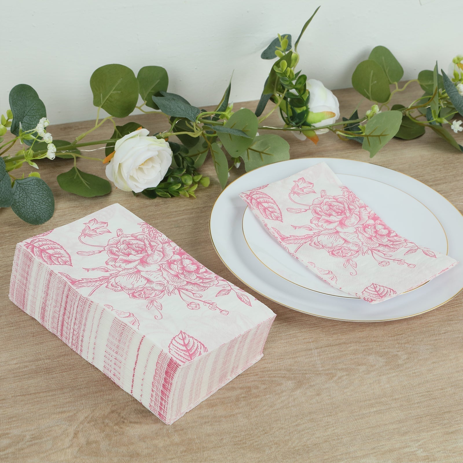 50 Pack 2-Ply Paper Party Napkins in French Toile Floral Pattern, Matte Pink and White Highly Absorbent Soft Disposable Dinner Napkins