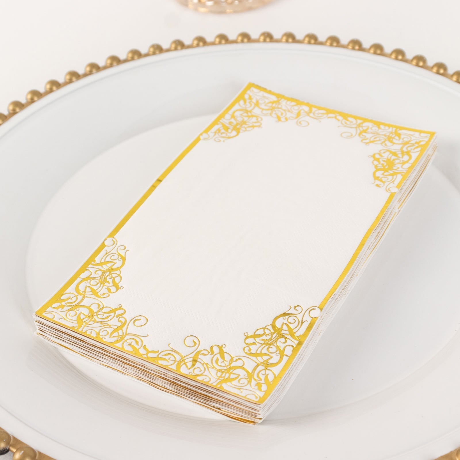 50-Pack Paper Dinner Napkins White with Gold Foil Lace Design 2 Ply - European Style Napkins for Parties 8"x4"