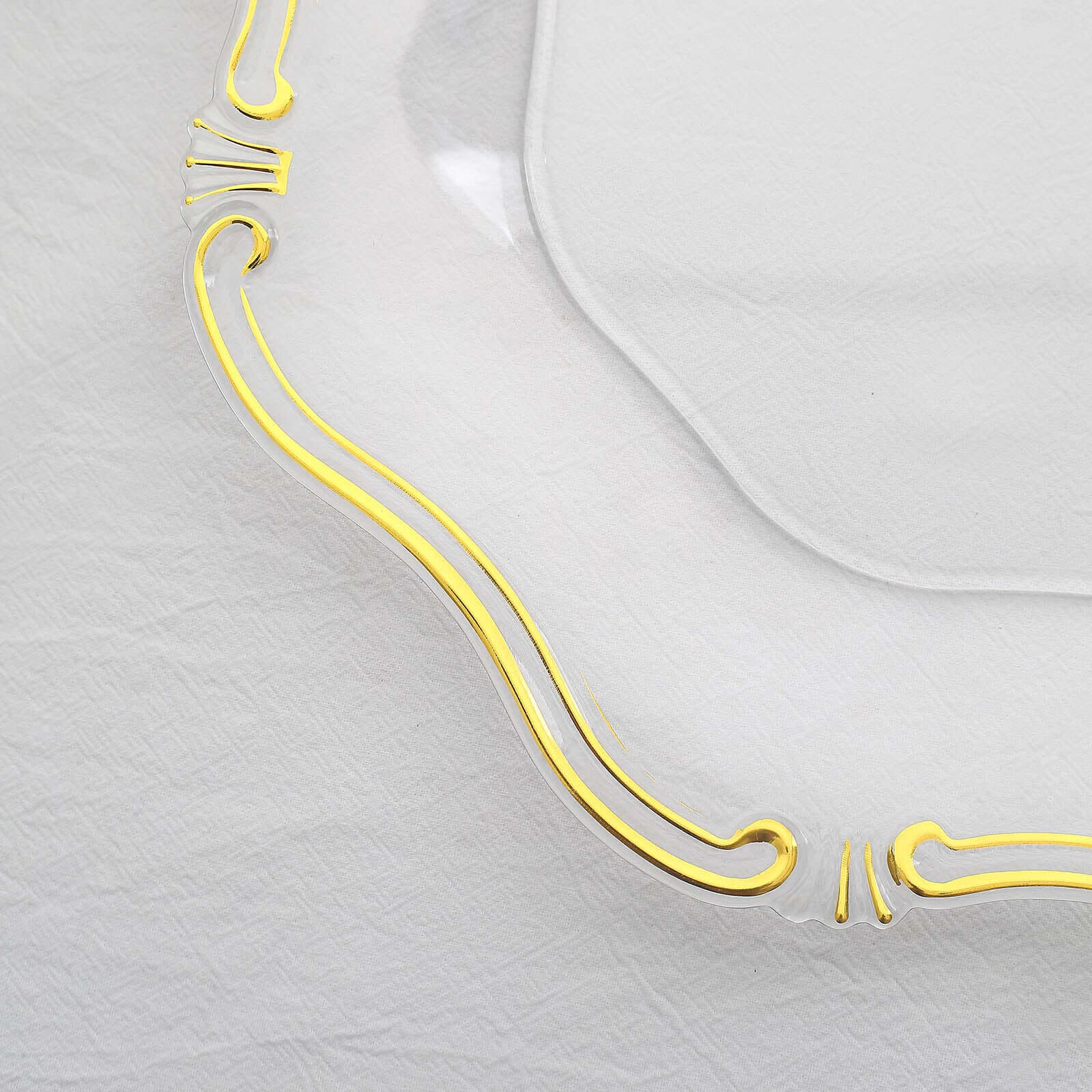 6-Pack Acrylic Plastic Hexagon Charger Plates 13" in Clear with Gold Baroque Scalloped Rim, Exquisite Dinner Serving Plates