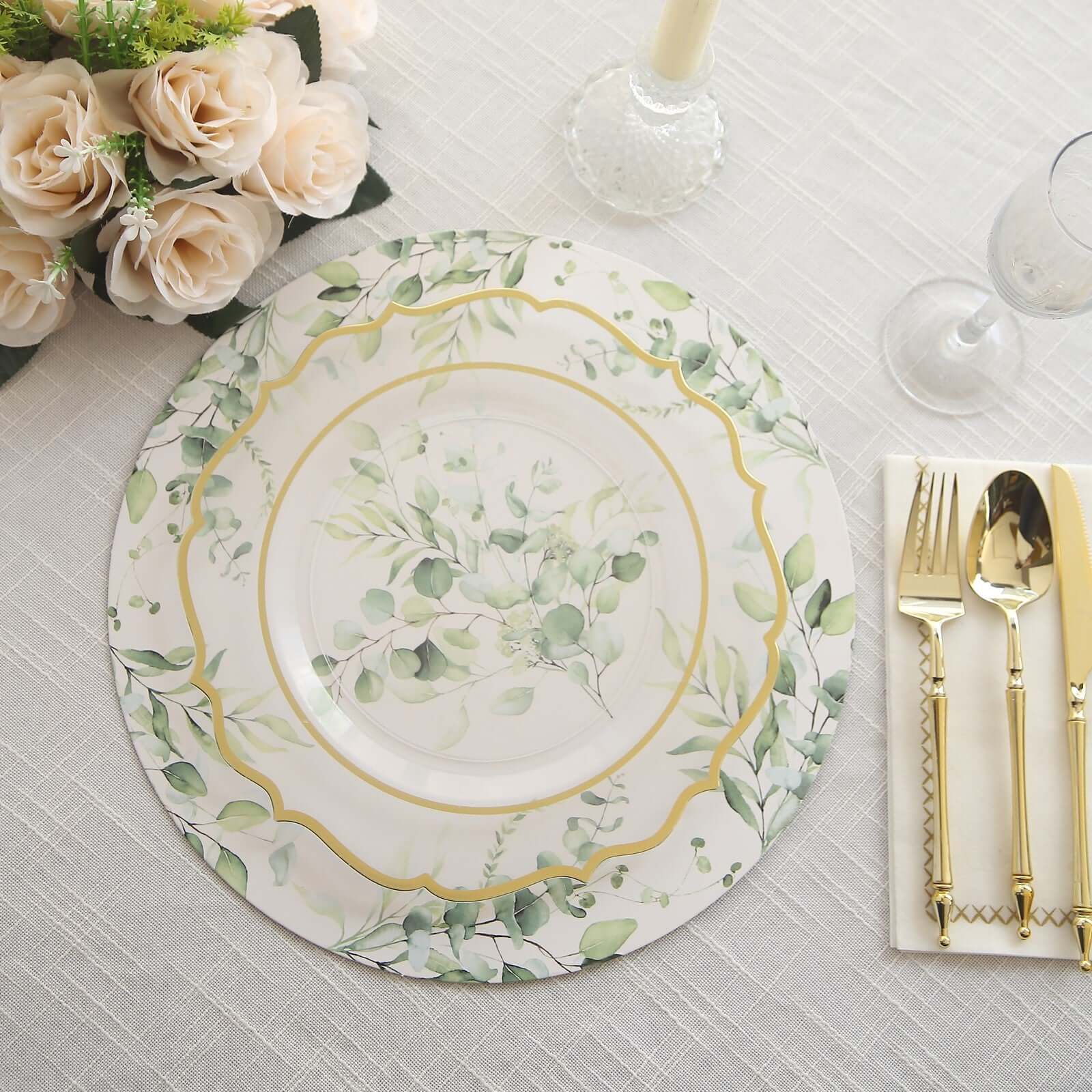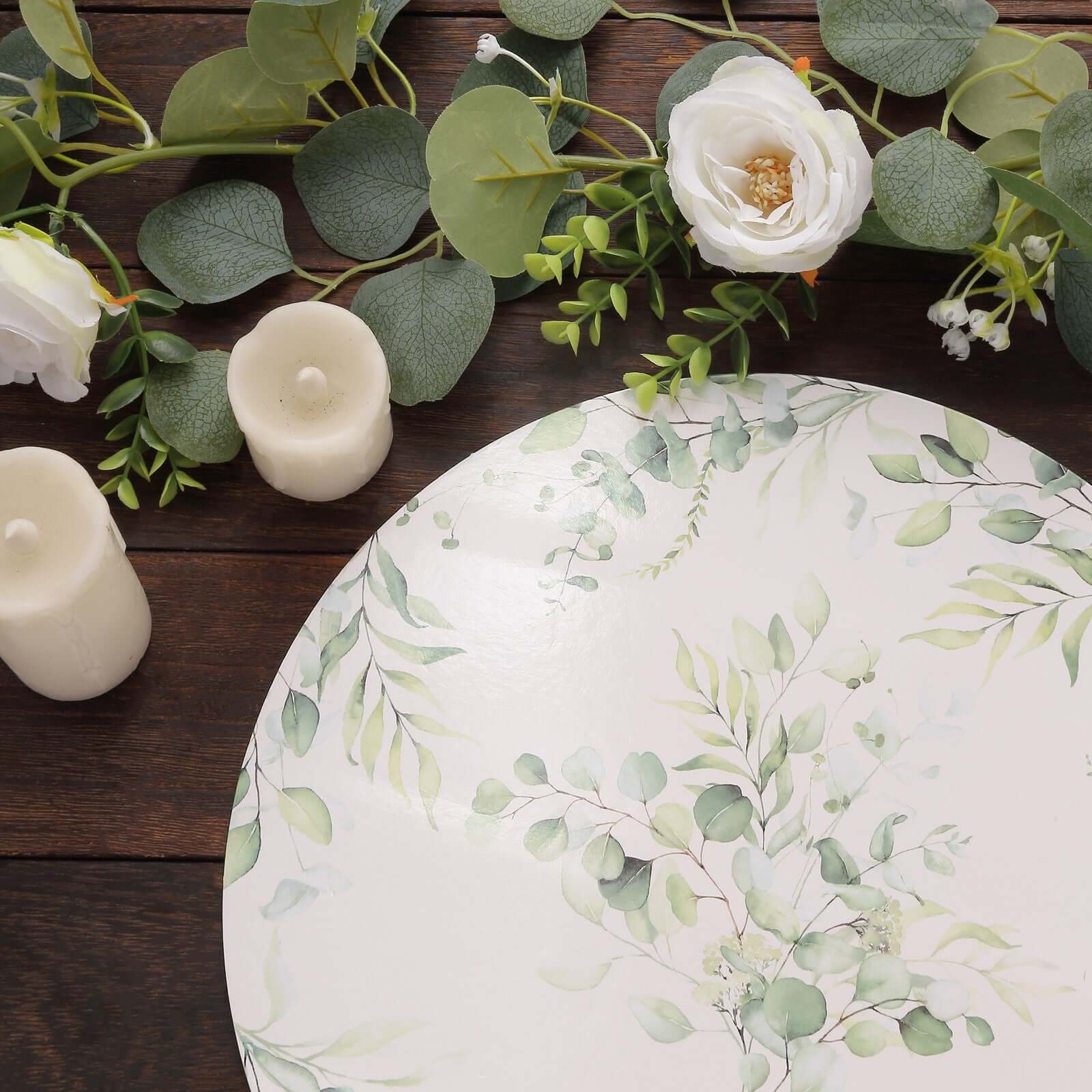 6-Pack Disposable Charger Plates in Eucalyptus Leaves Print 13" in White/Green - 700GSM Floral Paper Chargers for Stylish & Easy Cleanup