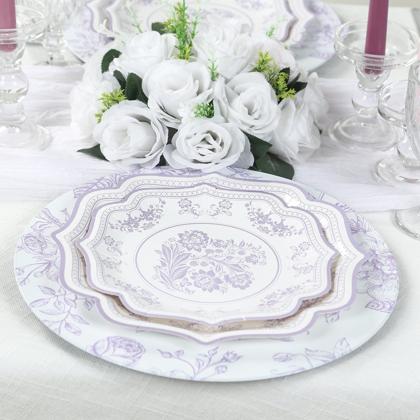 6 Pack Round Floral Acrylic Charger Plates in French Toile Pattern, 13" Matte Lavender and White Dinner Charger Event Tabletop Decor
