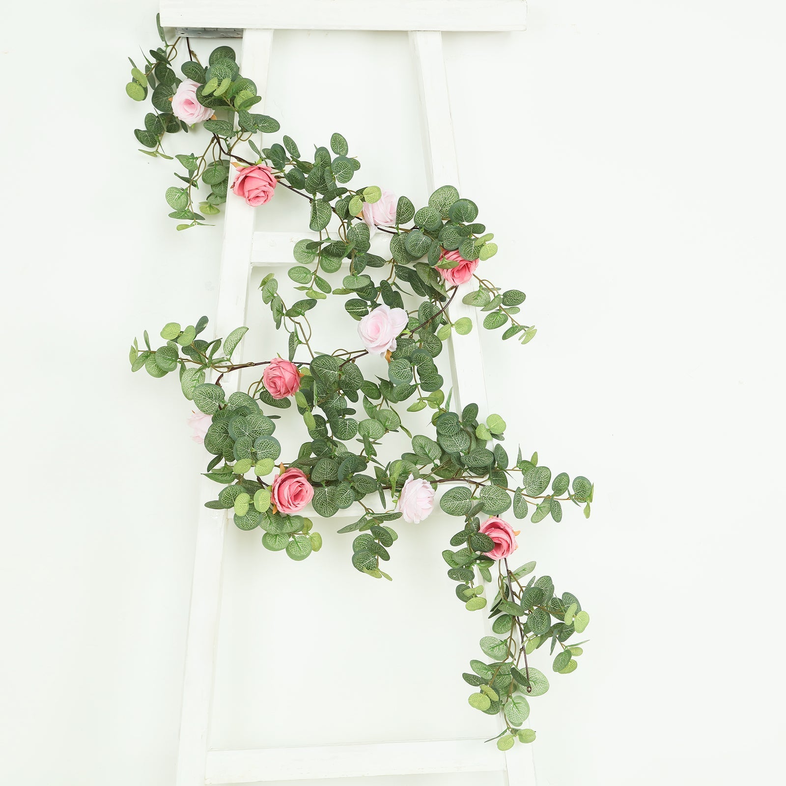 6ft Artificial Eucalyptus Garland with Blush/Dusty Rose Silk Roses – Faux Greenery Vine