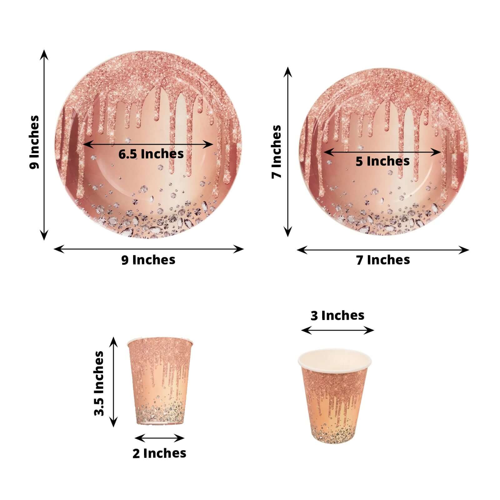 72 Pcs Paper Dinnerware Set with Diamonds Glitter Drip Pattern Rose Gold - Disposable Tableware Combo-Pack with Plates and Cups