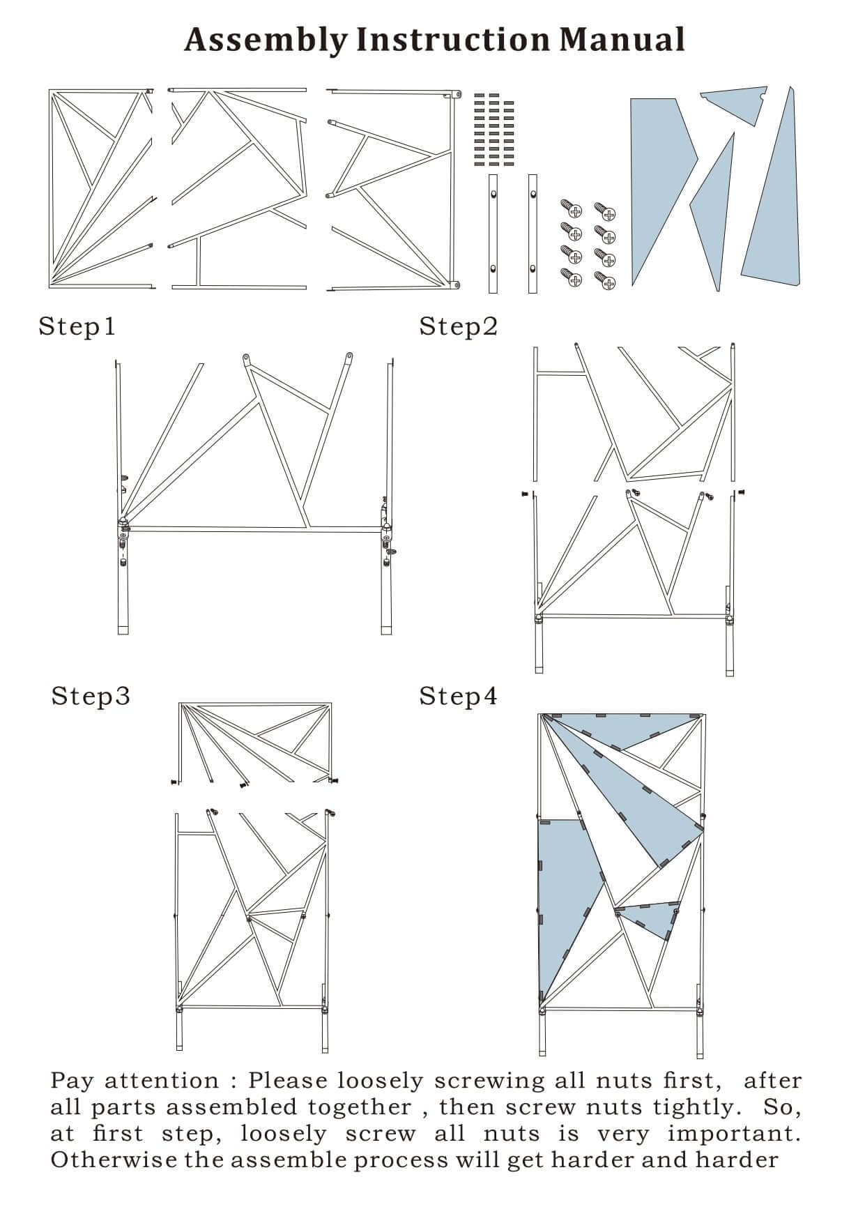 - Installation Tips:Â Loosely screw all nuts first. After all parts are assembled, then screw the nuts tightly.
