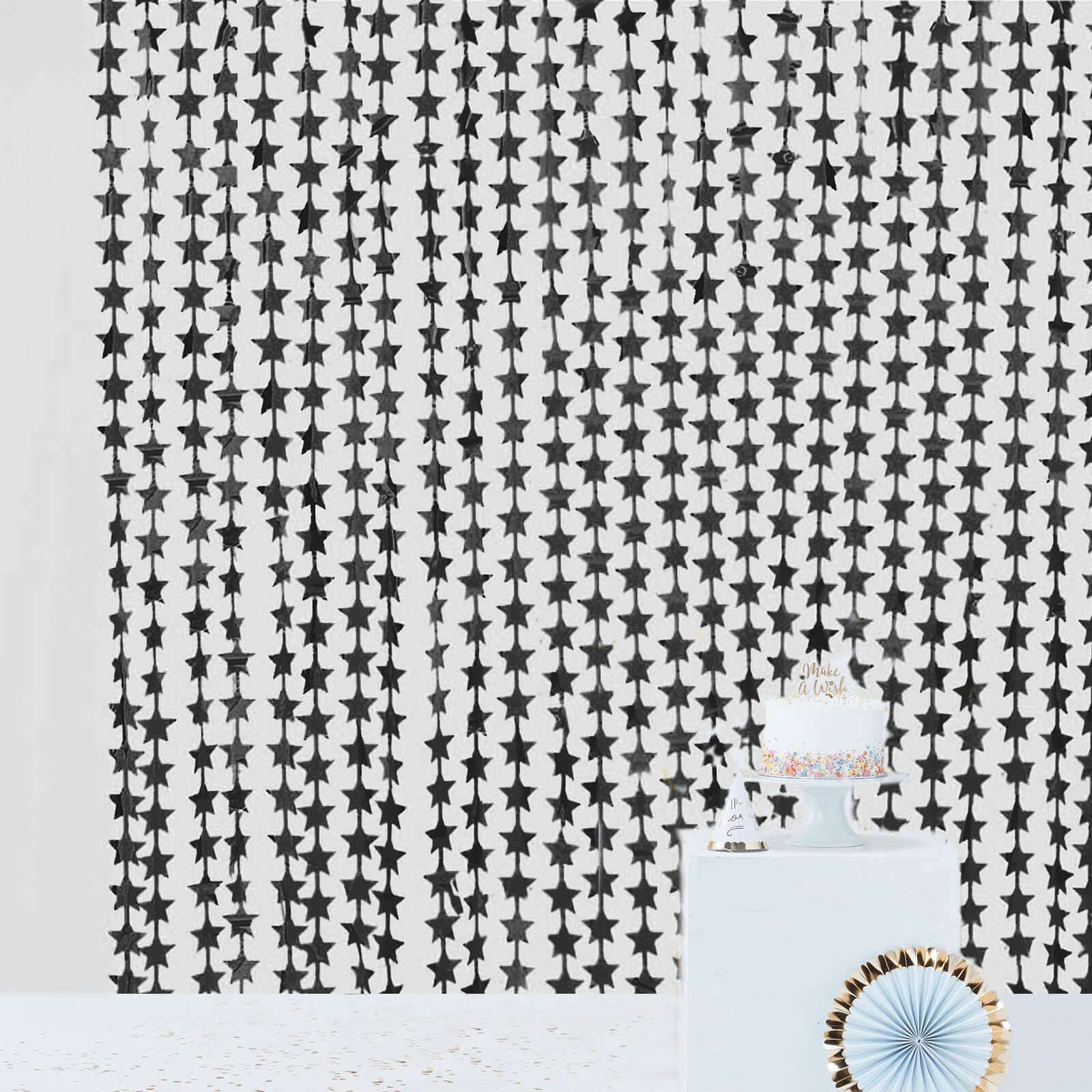 Black Star Chain Foil Fringe Curtain Party Backdrop, Metallic Black Tinsel Streamer Party Decor - Door Window Foil Curtain - 3ftx6.5ft