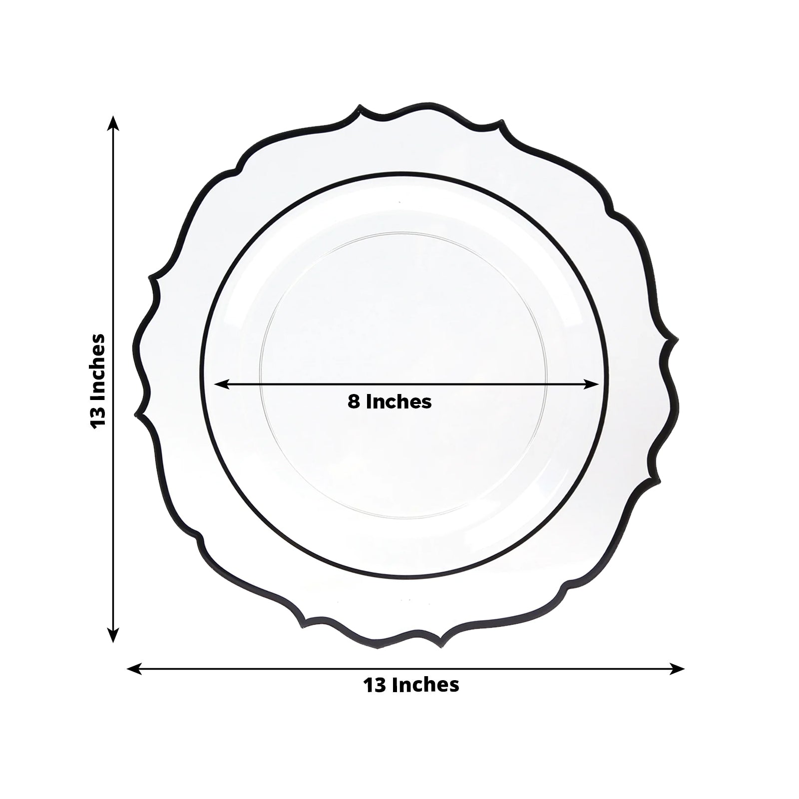 10-Pack Economy Plastic Round Charger Plates 13" in Clear with Black Scalloped Rim, Decorative Dinner Party Serving Plates