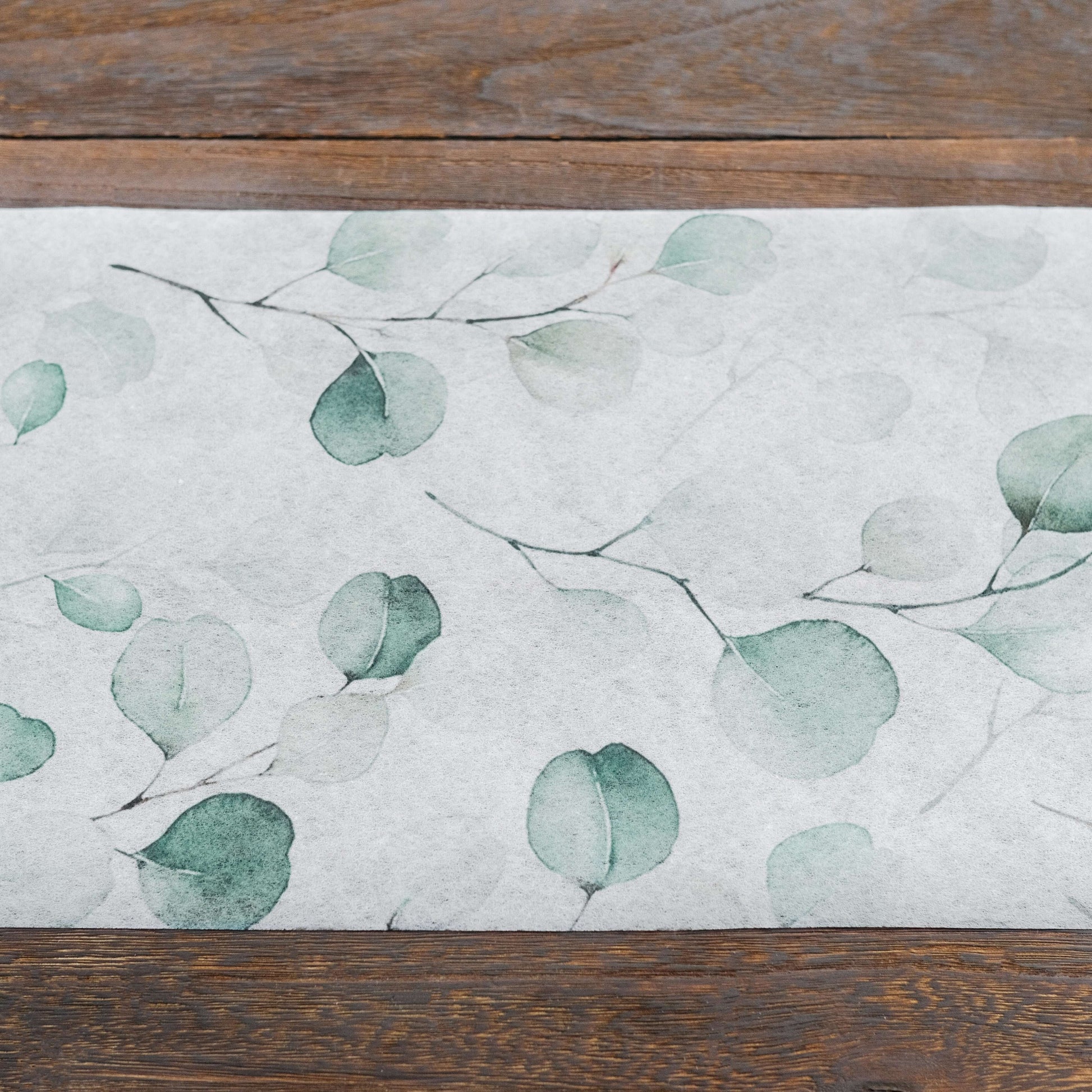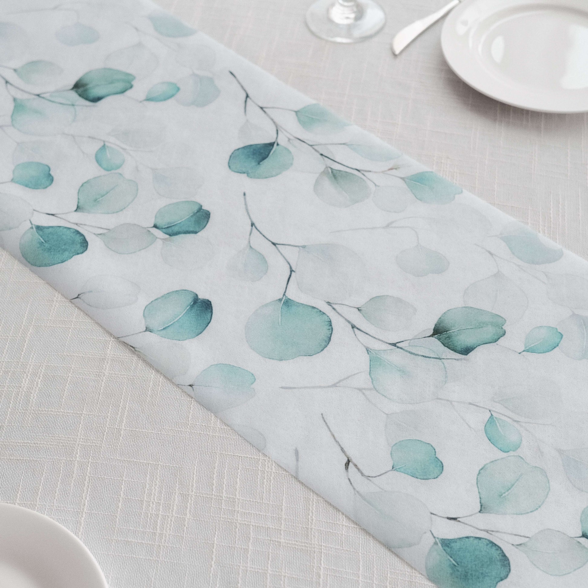 Disposable Table Runner 11"x108" White with Green Eucalyptus Leaves Print - Non-woven Stylish Spring Summer Dining Decor