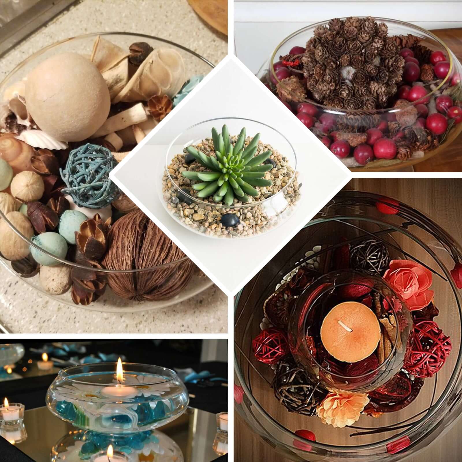 | For bowls only. Decorations, silk flowers, and candles are not included. |
