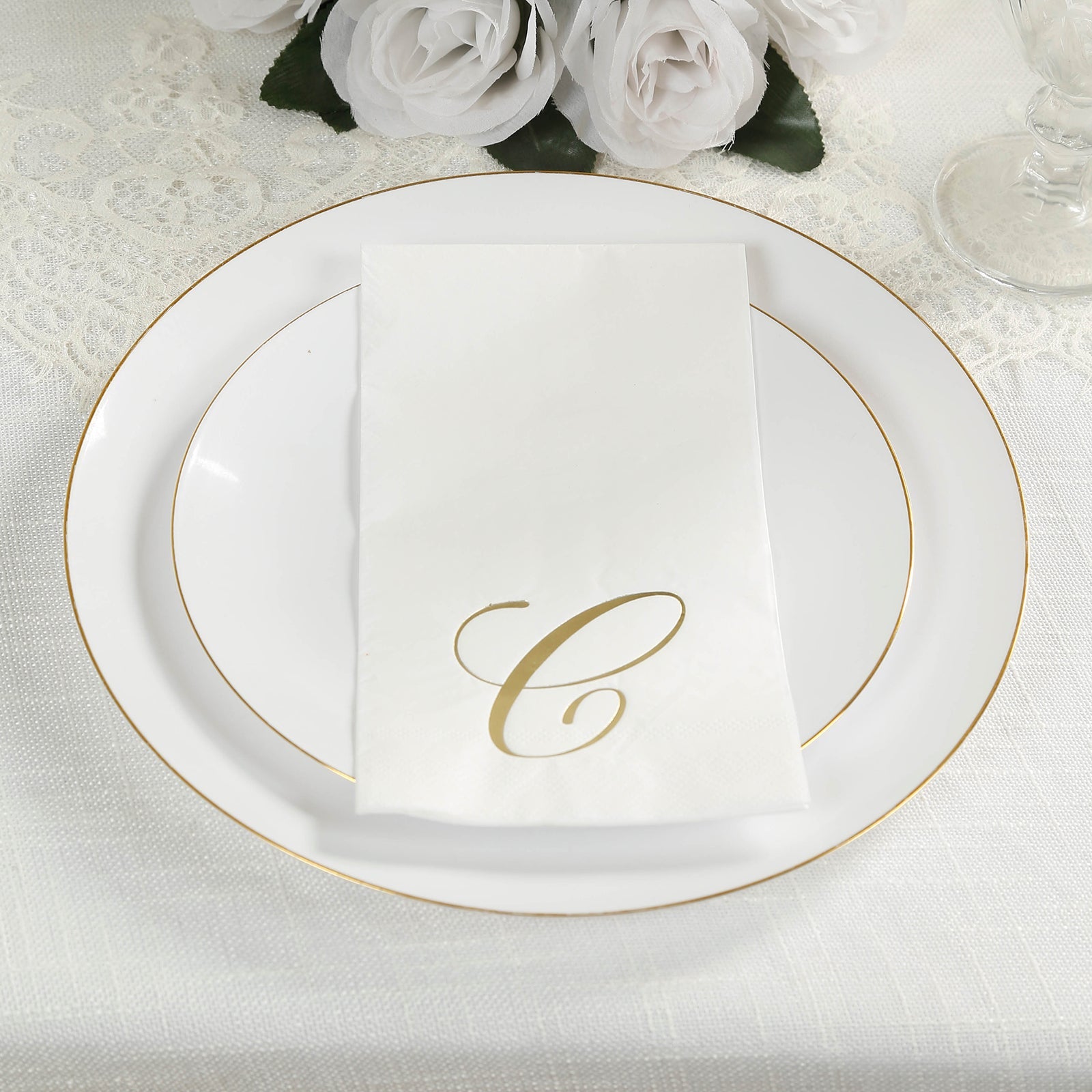 100 Paper Dinner Napkins White with Gold Foil Monogram "C" – 8"x4" Folded, Disposable Party Napkins