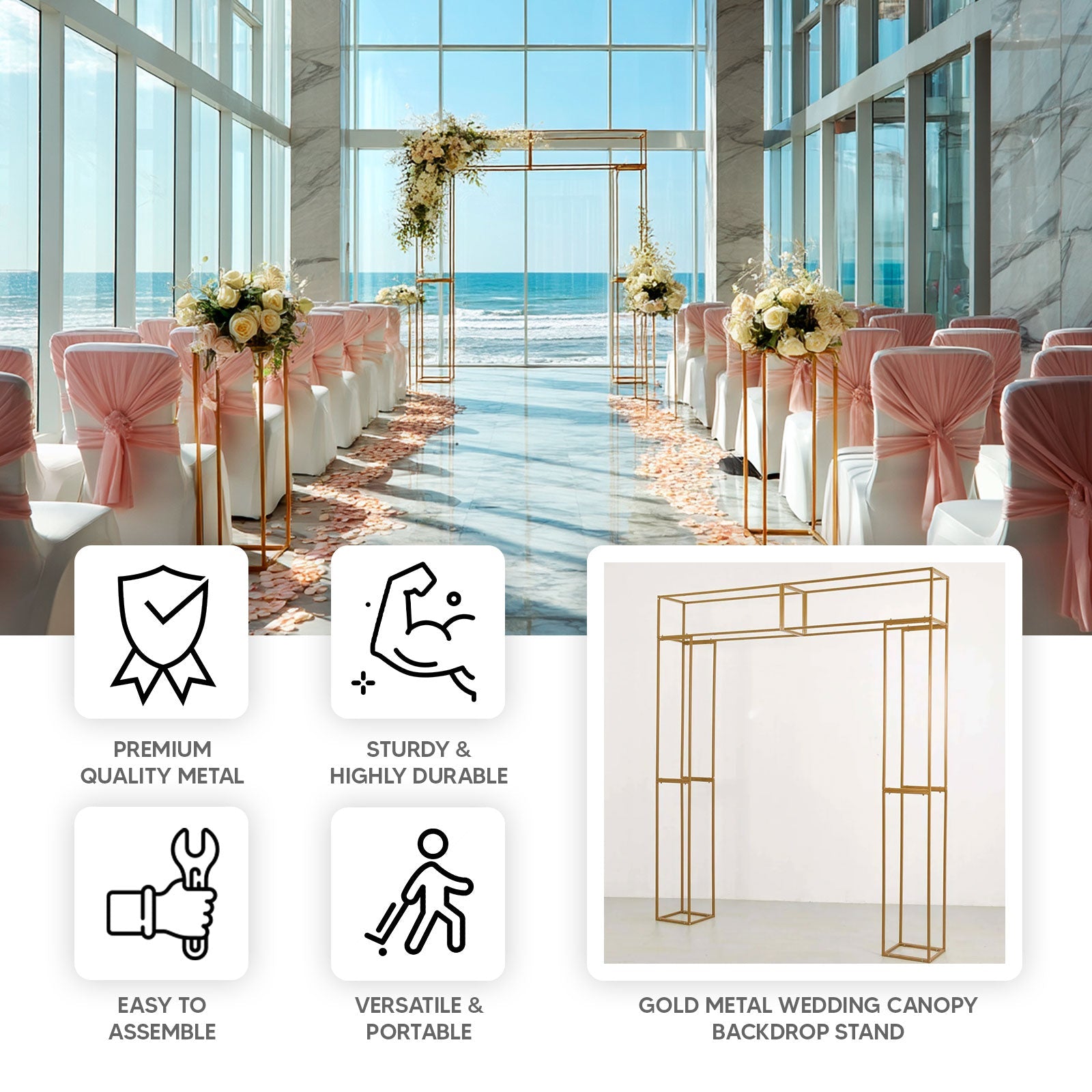 Heavy Duty Gold Metal 3D Rectangular Wedding Arch, 8ft Floral Balloon Frame Backdrop Stand
