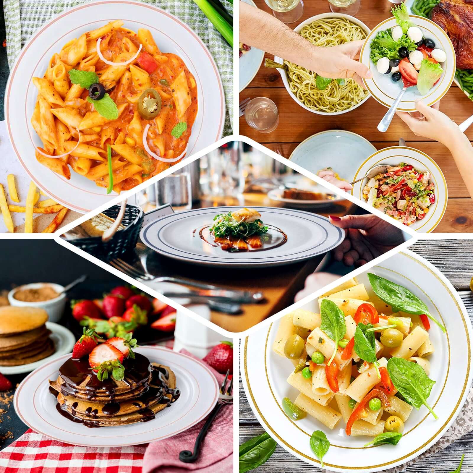 10-Pack Plastic Dinner Plates White with Très Chic Rose Gold Rim - Perfect Disposable Party Plates 10"