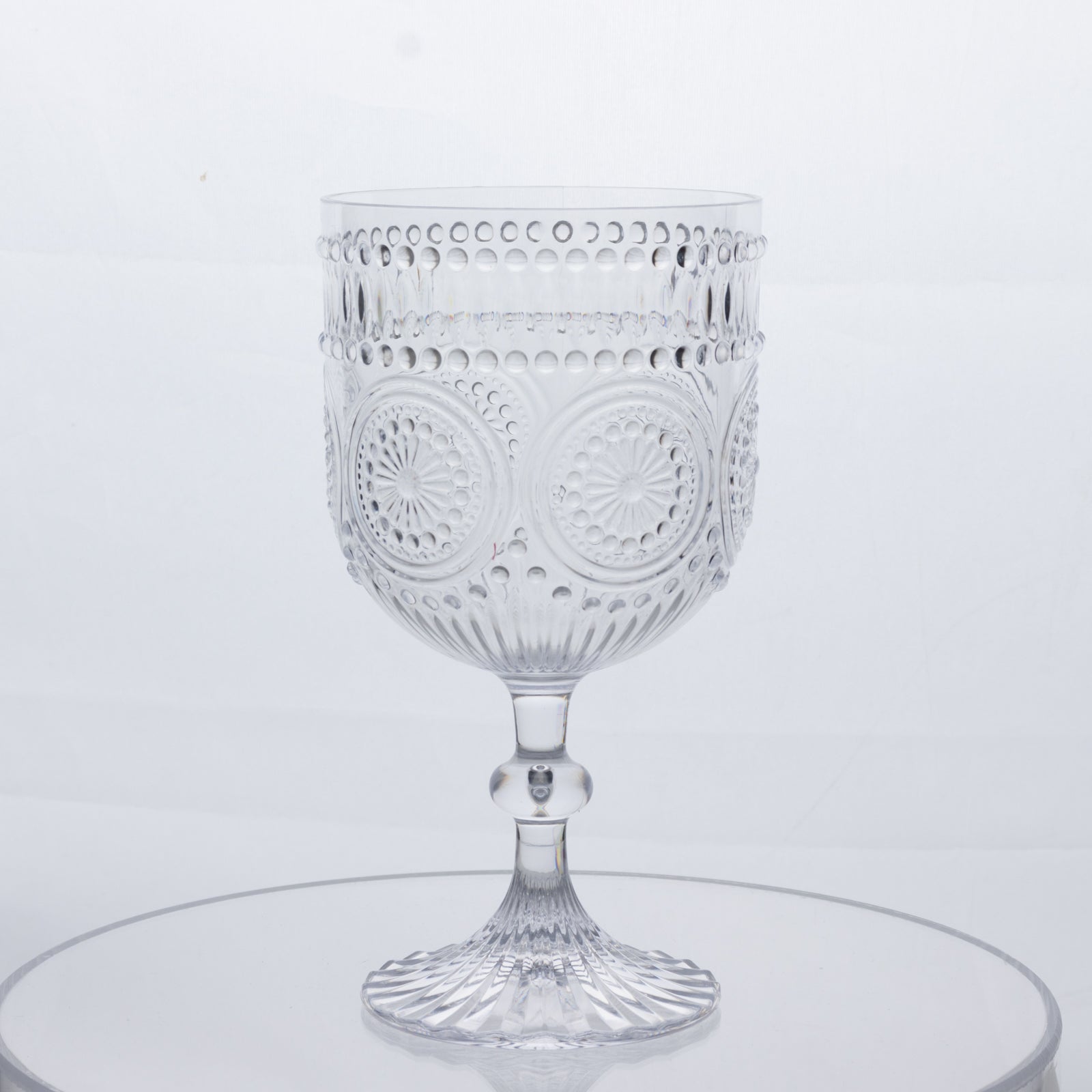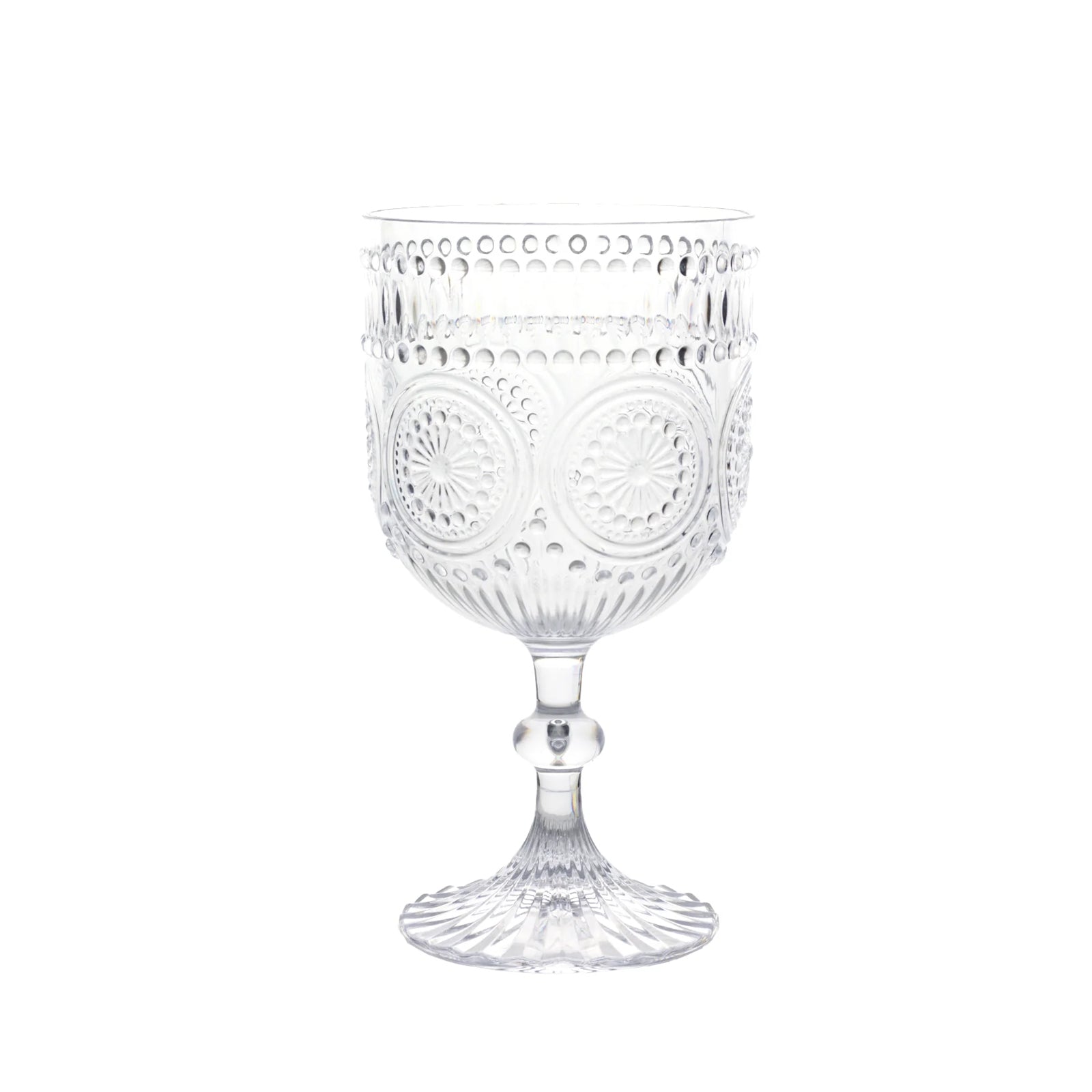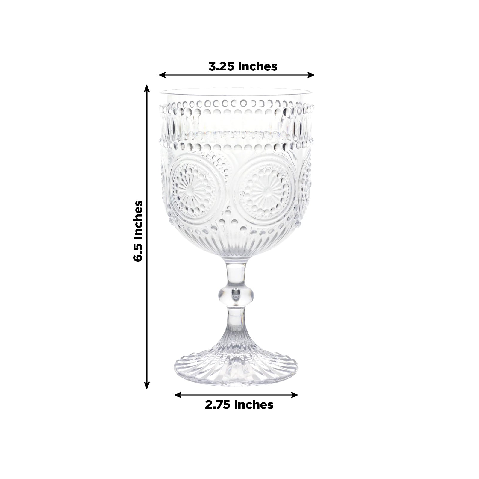 12 Pack Vintage Plastic Wine Goblets – 15oz Reusable Shatterproof Clear Embossed Floral Pattern Drinkware, Decorative Cups
