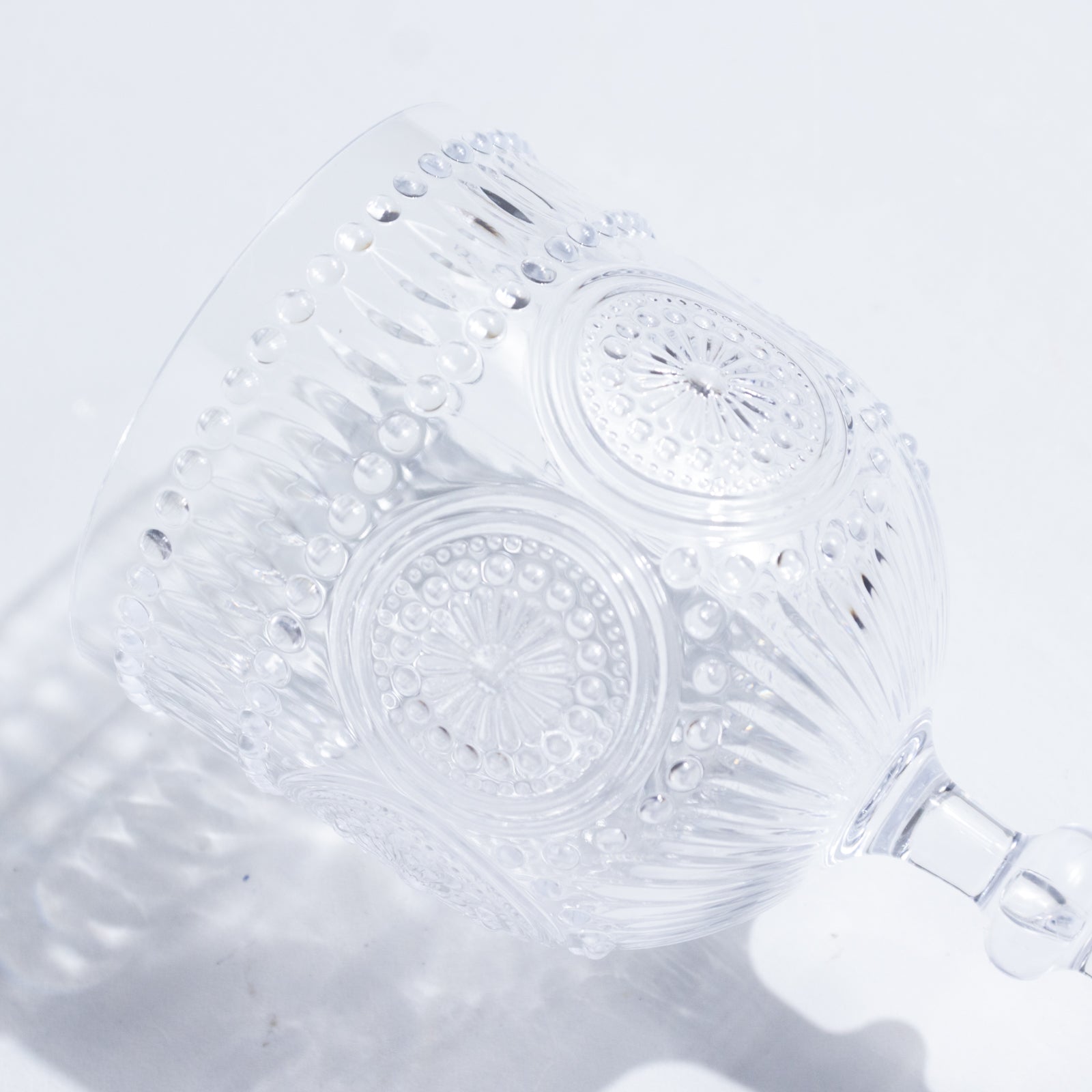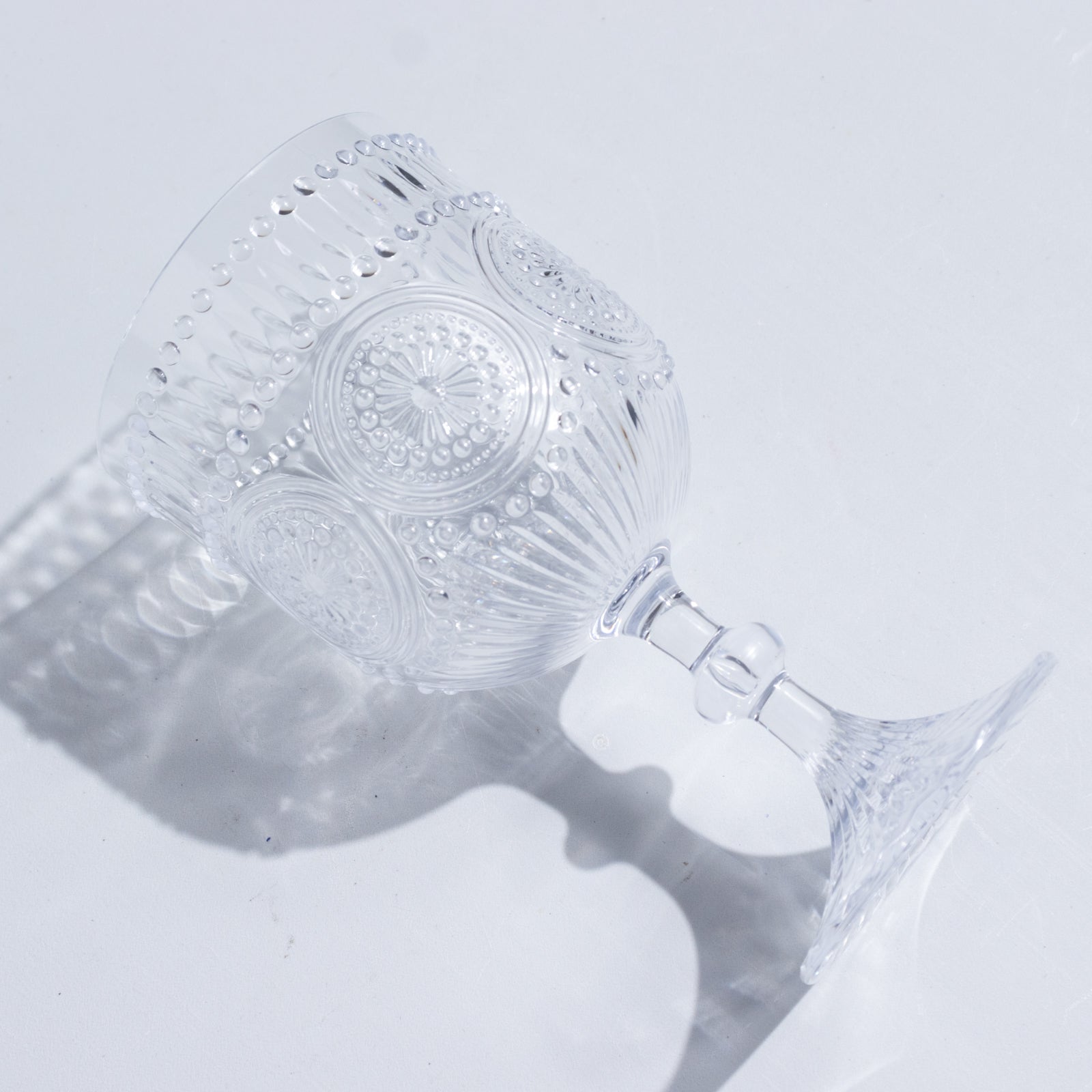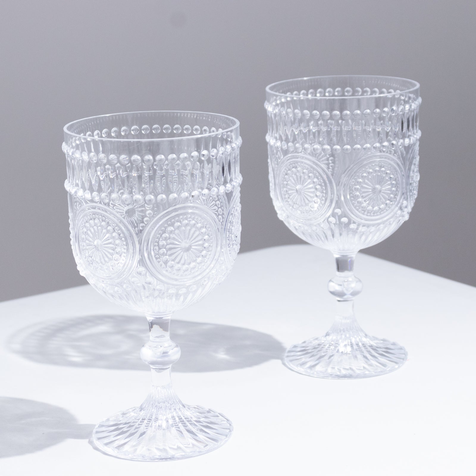 12 Pack Vintage Plastic Wine Goblets – 15oz Reusable Shatterproof Clear Embossed Floral Pattern Drinkware, Decorative Cups