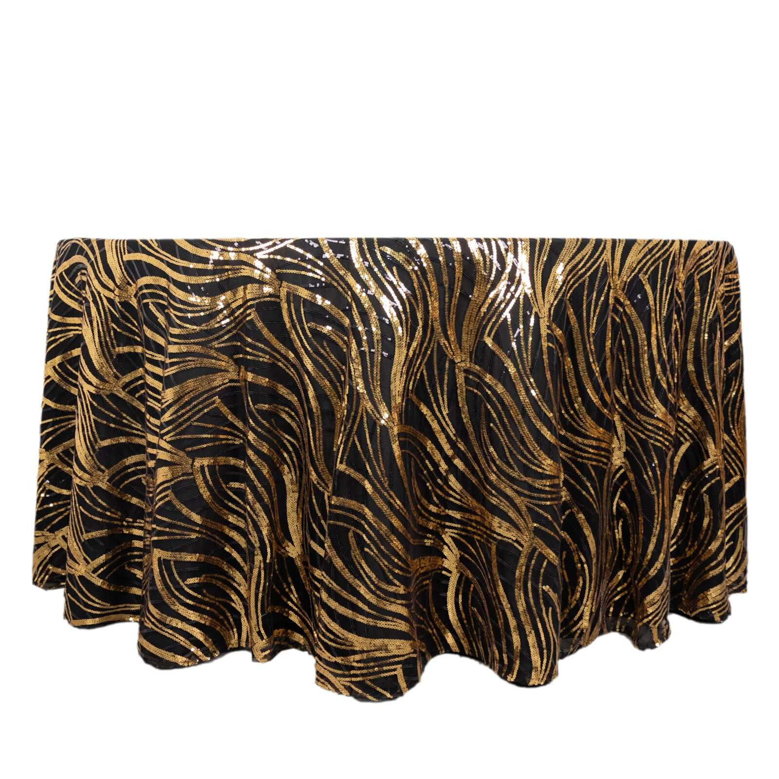 Sequin Mesh 120" Round Tablecloth Black/Gold - Seamless Wave Embroidered Table Cover