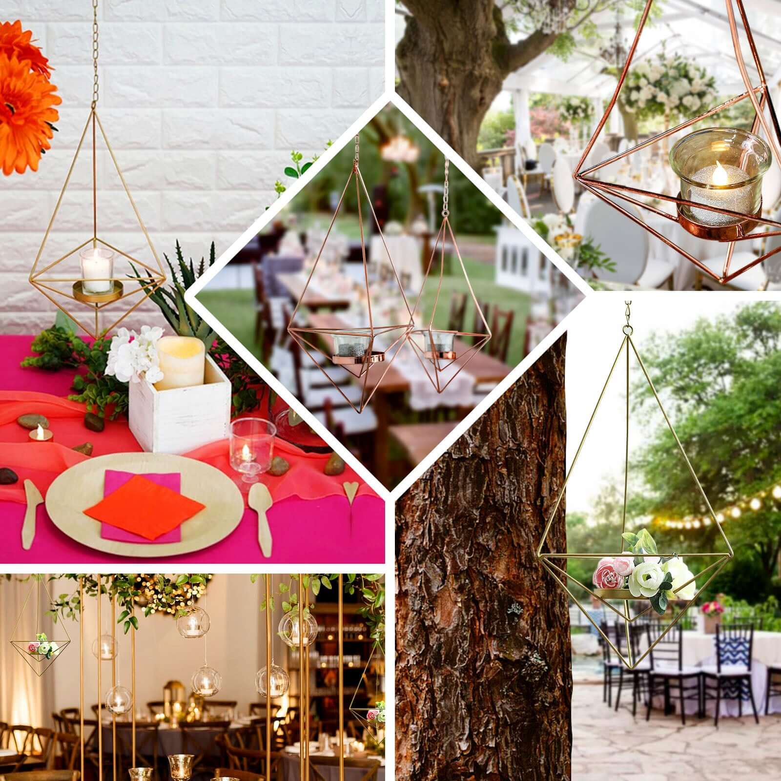 Set of 2 Hanging Tealight Candle Holders Rose Gold Metal Diamond Geometric Open Frame - Flower Terrariums 12", 15"