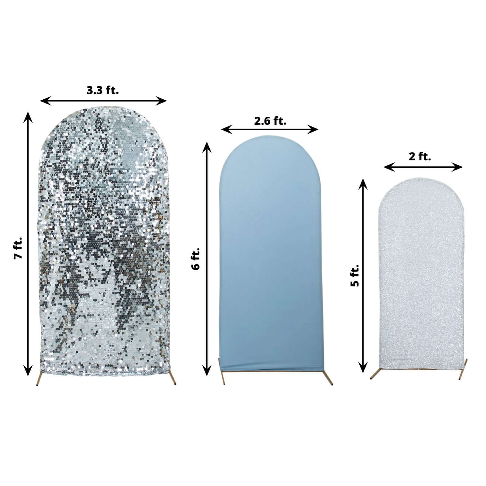 Set of 3 Dusty Blue Silver Round Top Fit Wedding Arch Frame Covers, Big Payette Sequin, Shimmer Tinsel and Matte Spandex Backdrop Stand Covers