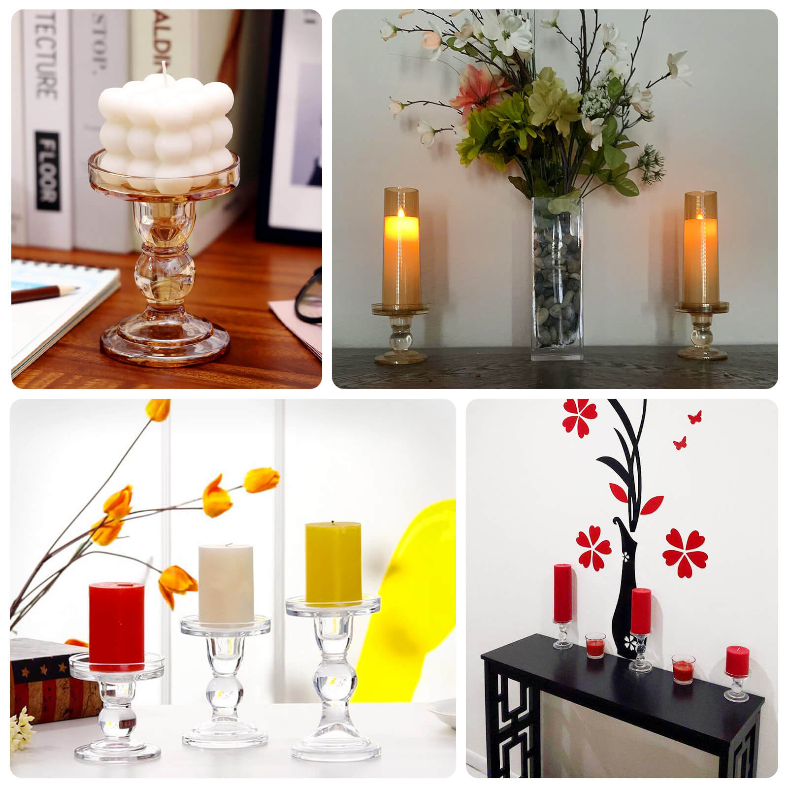 Set of 3 Glass Pillar Candle Holders Clear with Round Tray - Crystal Ball Stem Taper Candlestick Tea Light Stands 3.5", 4.5", 5.5"