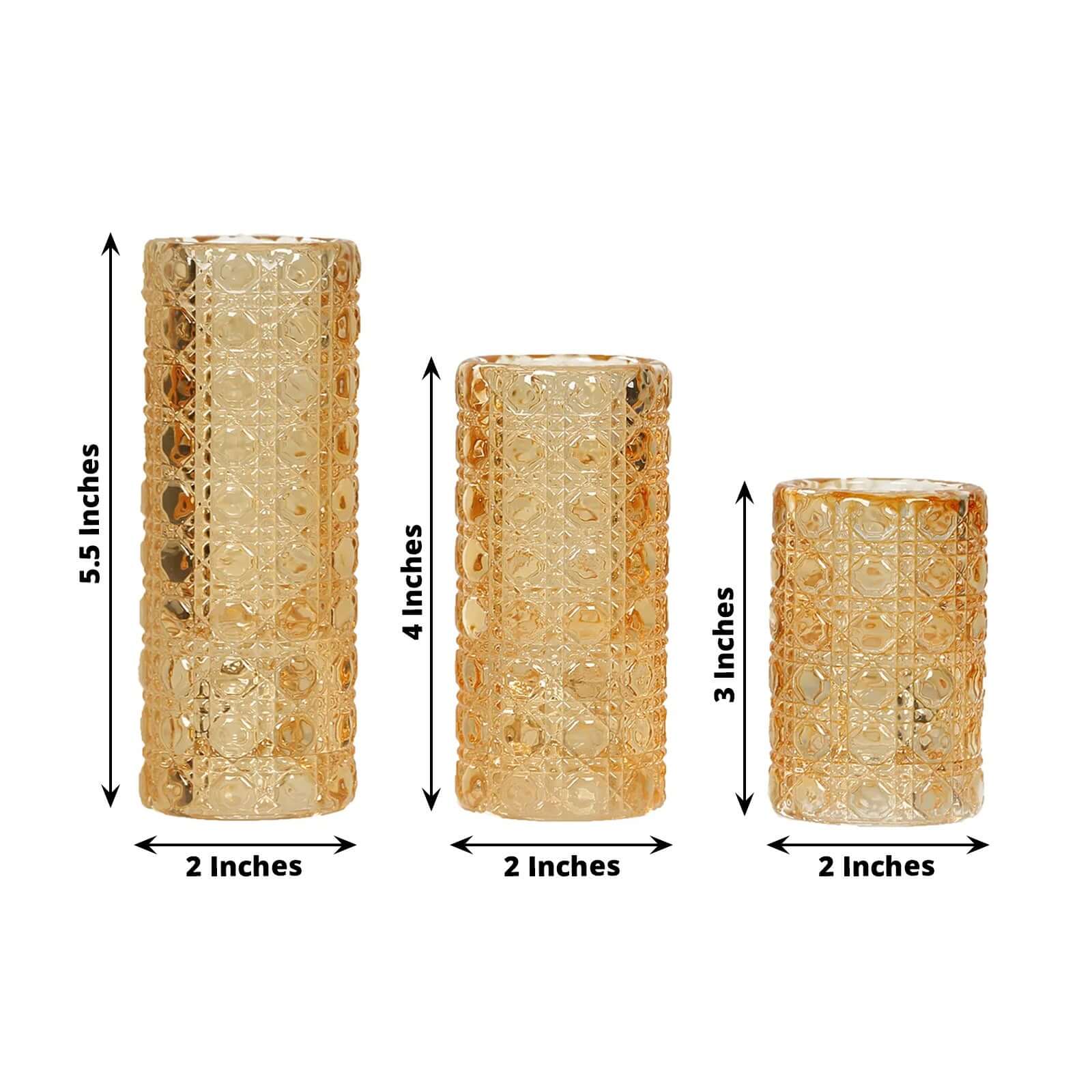 Set of 3 Glass Taper Candle Holders Amber Gold with Gemstone Pattern - Dual Sided Crystal Cylinder Tealight Stands 3", 4", 5.5"