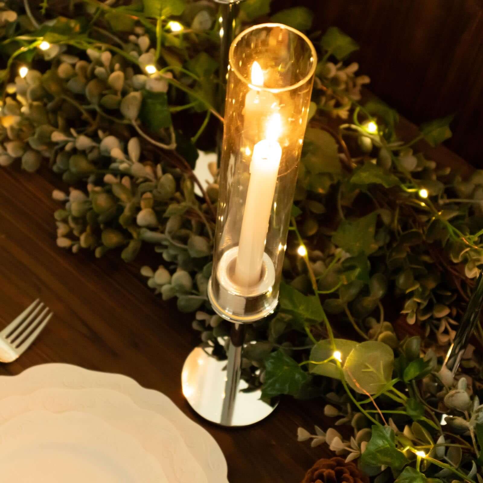 Set of 3 Tall Silver Metal Taper Candlestick Holders, Clear Glass Hurricane Candle Stands With Chimney Candle Shades 16", 20", 24"