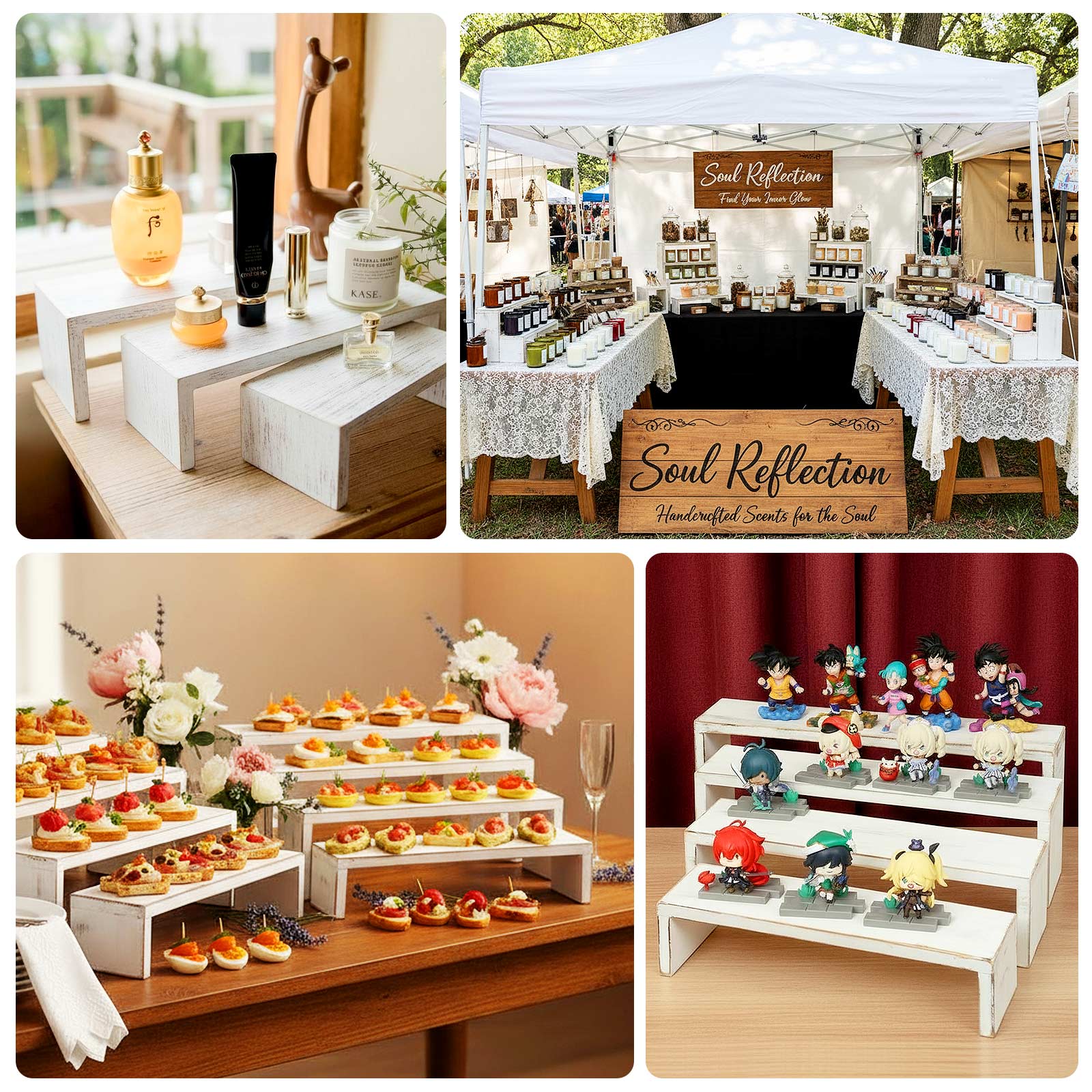 Set of 4 Wooden Display Risers Whitewash Rectangular Bench Style - Stackable Rustic Farmhouse Nesting Stands 14", 16", 17", 19"